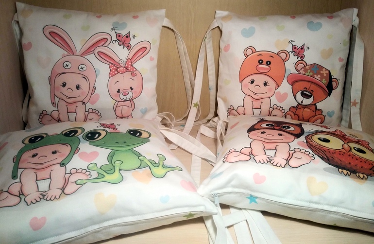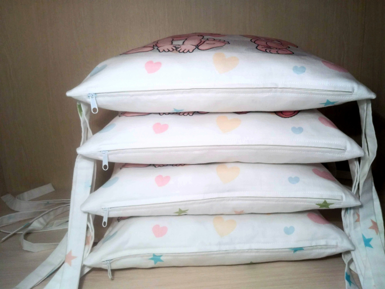 Комплект в кроватку с бортиками состоит из простыни на резинке, пододеяльника, наволочки. Сшит из сатина, состав 100 % хлопок.