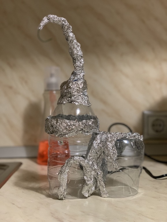 В основе пластиковая бутылка, фольга и проволока. Все склеили.