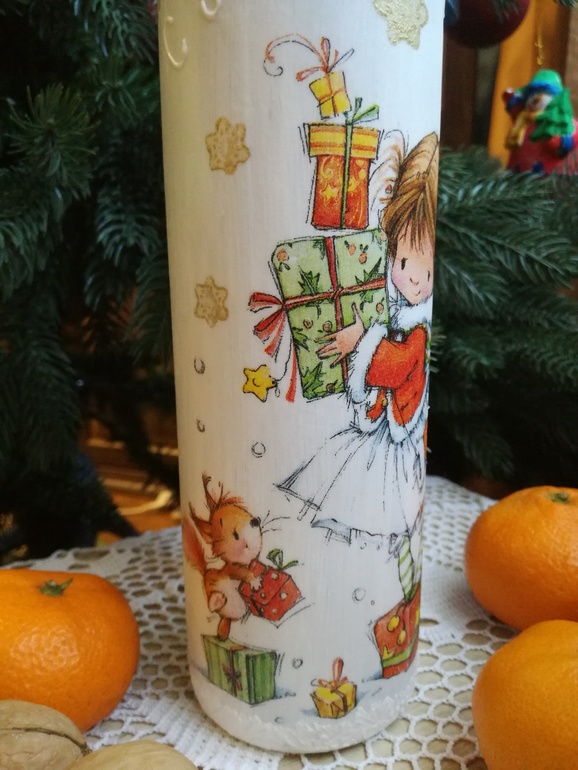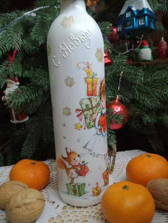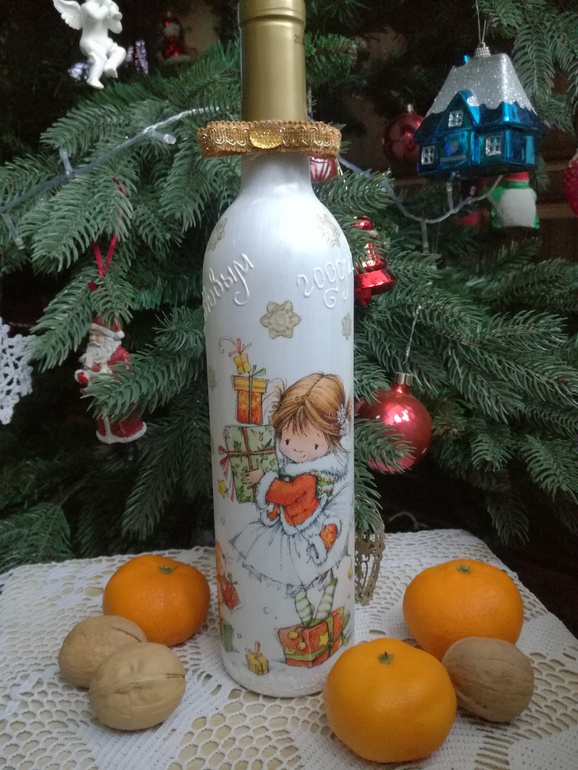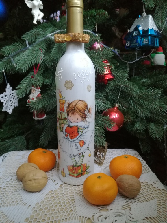 Это подарок для подруги на праздничный стол. Так-то я ей планировала подарить шампанское( тоже уже готово, но покажу позже). Какой Новый год без него, думала я!!! Да вот только в последний момент узнала, что она предпочитает красное вино! Вот это промах! Пришлось за два дня как-то выкручиваться! И вот, что вышло!