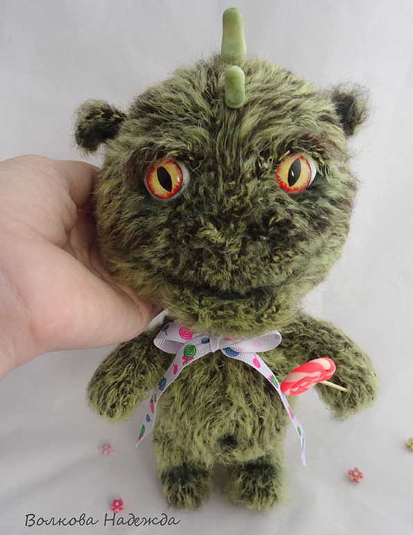 Малыш динозаврик, который очень любит конфетки, лапки на нитяном креплении, леденец и гребешки слеплены из полимерной глины. Ростиком 25 см, стоит сам, сидит с опорой.