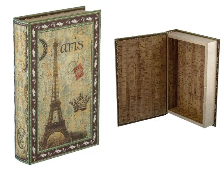 Шкатулка-книга "Париж", основа - дерево, обтянута атласной тканью. Шкатулка имеет 1 отсек и крышку на магните. Размер 26*17*5 см. (Протирать чистой, сухой тканью. Не допускать контакта с водой). Предназначена для хранения рукодельных мелочей и не только :-)