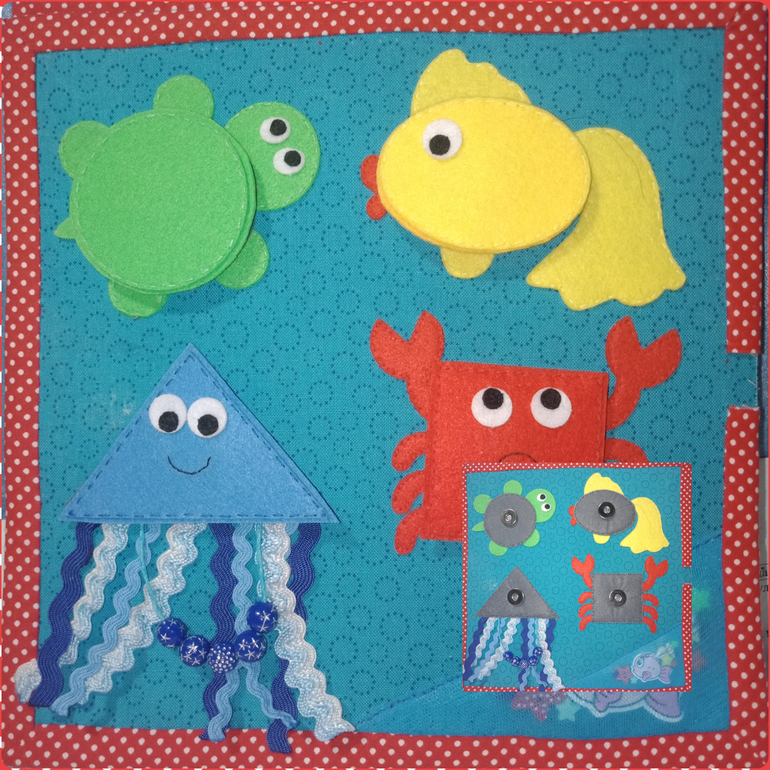 Изучаем счет до четырех. Изучаем основные цвета - зеленый, желтый, синий, красный. Изучаем основные геометрические фигуры - круг, овал, треугольник, квадрат. Изучаем морских обитателей - черепашка, рыбка, медуза, краб. Изучаем простейшие эмоции - медуза улыбается, краб грустит. Детали крепятся на магнитные кнопки - учимся ими пользоваться и соотносить детали и их контуры. Тактильные элементы - щупальца медузы (перебираем ленты и бусины, бусины можно посчитать, счет до пяти), в уголке страницы под сеткой бусины и пуговки (передвигаем пальчиками)