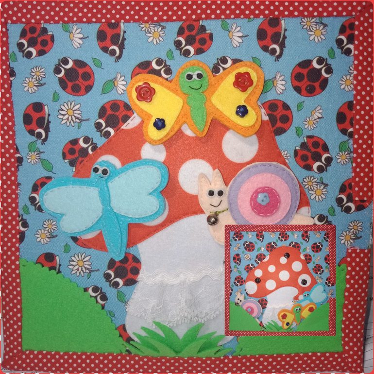Как играем? Изучаем насекомых - бабочка, улитка, стрекоза. У улитки на шее бубенчик, он звенит, если потрясти, на раковине - пуговка. У бабочки на крылышках тактильные элементы - пуговки (изучаем понятия большой-маленький). Все насекомые крепятся к грибочку на пришивные кнопки, или прячутся в "кармашках" травы.