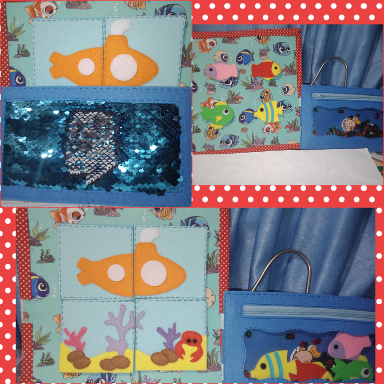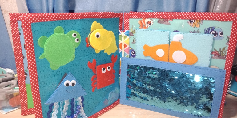 Пазл из крупных деталей, которые крепятся на липучки. У крабика глазки бусинки (тактильный элемент) Откидной кармашек на молнии (учим малыша пользоваться молнией). В кармашке живут рыбки (они тоже на липучке, их можно крепить вместо пазла).Кармашек с секретом)) Туда вшит прозрачный карман с пайетками и декоративной пуговкой рыбкой, а на оборотной стороне тактильный элемент - ткань с двухсторонними пайетками.