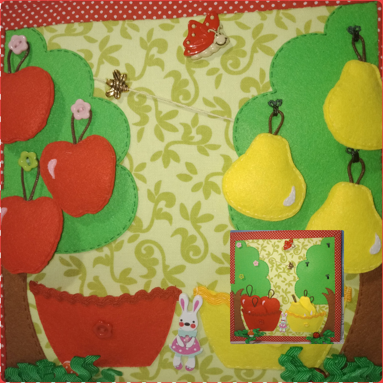 Как играем? Пчелка "летает" с дерева на дерево. Тактильные элементы - пуговка бабочка, травка у деревьев, между корзинками декоративная пуговка зайка, в травке спрятаны декоративные пуговки грибочек и божья коровка.Детки обожают находить такие сюрпризы)) Учим пальчики работать - вешать яблочки и груши на крючки. Учим счет до трех и до шести. Изучаем как выглядят яблоки/груши, что они растут на деревьях, это фрукты. "Собираем" фрукты в корзины, сортируем их по цвету.