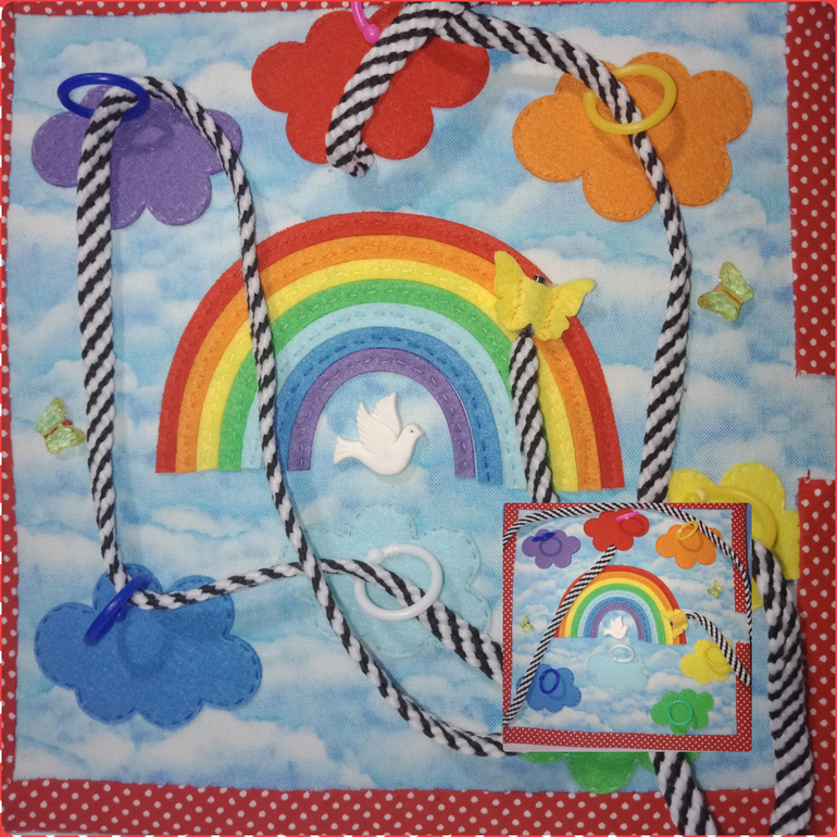 Изучаем цвета радуги. Осваиваем свободную шнуровку. Бабочка путешествует с облака на облако, пропускаем шнурочек через колечки. Тактильные элементы - декоративные пуговички бабочки и голубь.