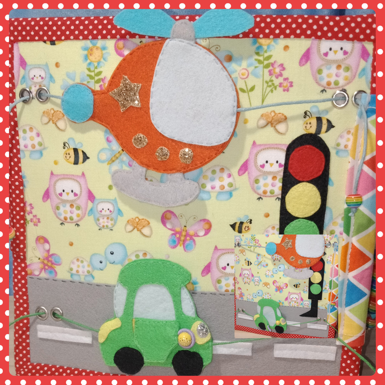 На задней обложке расположился транспорт. Вертолетик "летит" на перетяжке , машинка "едет", открывается дверь. Учим сигналы светофора.