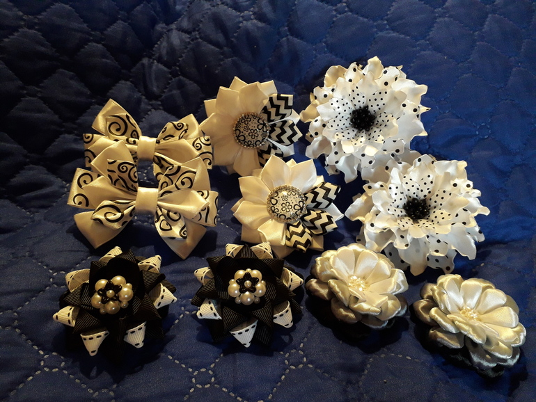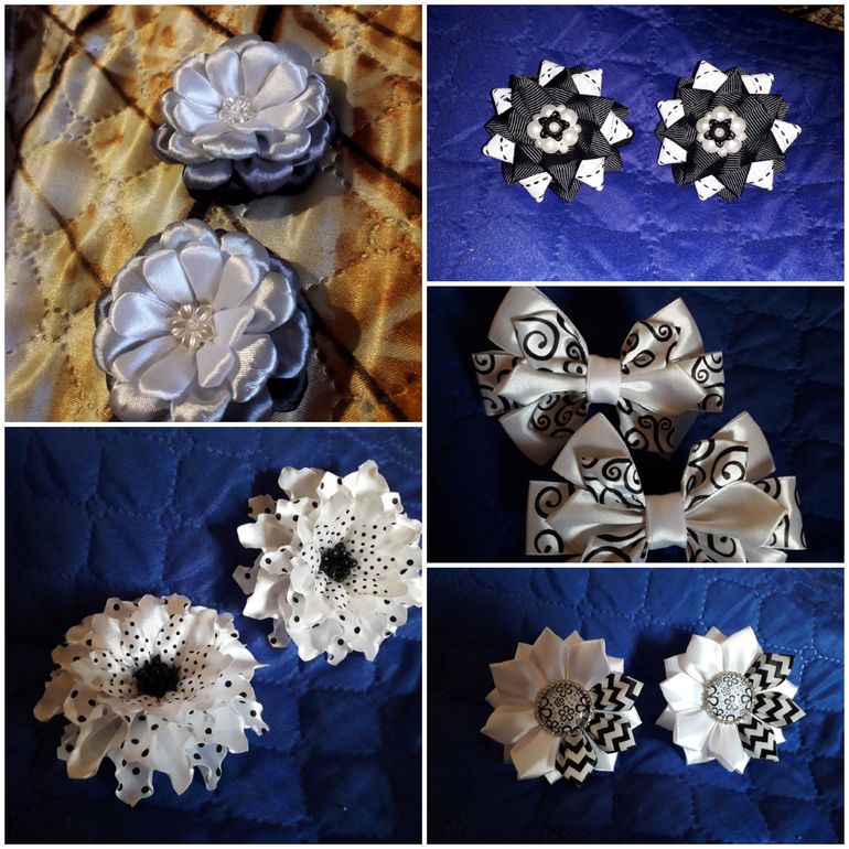 Лот для школьницы - 5 пар украшений для волос. Все черно-белые на резинках, цветы с серым(фото на золотистом фоне) на мет.зажиме.