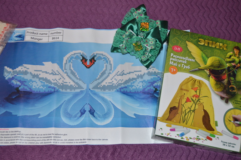 алмазная мозайка "лебеди", набор для раскрашивания рюкзачка и бантики для волос на резинках