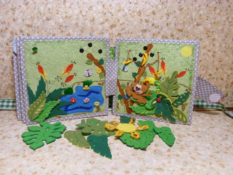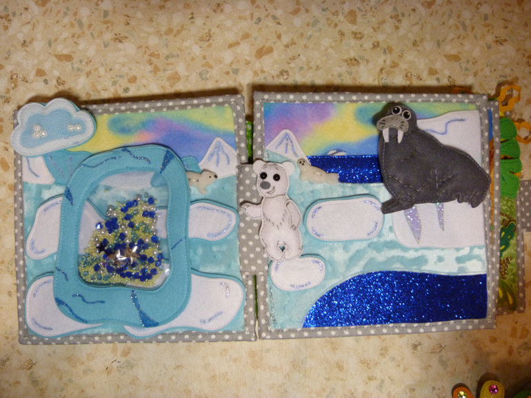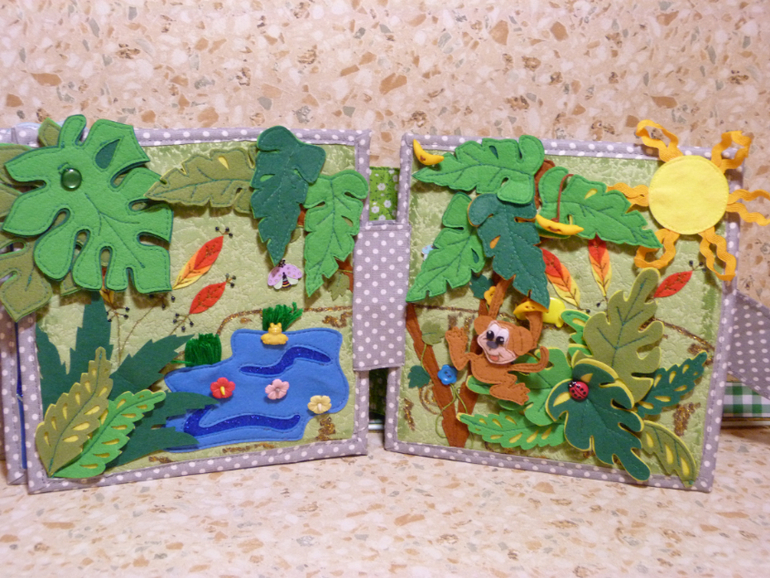 Все звери - самостоятельные игрушки, в книге множество съёмных элементов : льдины, тучка, солнышко, рыбки,листья пальм, использованы различные виды застёжек : кнопки, пуговки,липучки. Льдина представленна в виде 2-х сторонней игрушки-искалочки, так же на страничках вы найдёте магнитную игру - рыбалку, а обезьянка умеет спускаться с пальмы на лиане. Приятного просмотра !