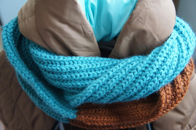 Но для тех, кто вяжет спицами. Я себя отношу к той категории, которая не умеет вязать спицами, я "крючкоманка". Год попыток вязания берета не увенчался успехом. "Берет" начал превращаться в снуд. Но я же "не умею вязать" спицами😆. Началось "видео обучение"...на этот раз английская резинка. Дело пошло....Шло....шло и закончилось на самом интересном месте: снуд короткий(два мотка основных цвета ушло), а в городе нет больше такой пряжи. Поиски не дали положительного результата, пришлось докупить другой цвет ( такое сочетание идеально подошло к нашему пуховичку).... и опять незадача -НЕ ПОНИМАЮ КАК СОЕДИНИТЬ!!!!!!! На помощь пришла добрая женщина из отдела "Пряжа". За чисто символическую плату снуд готов!
