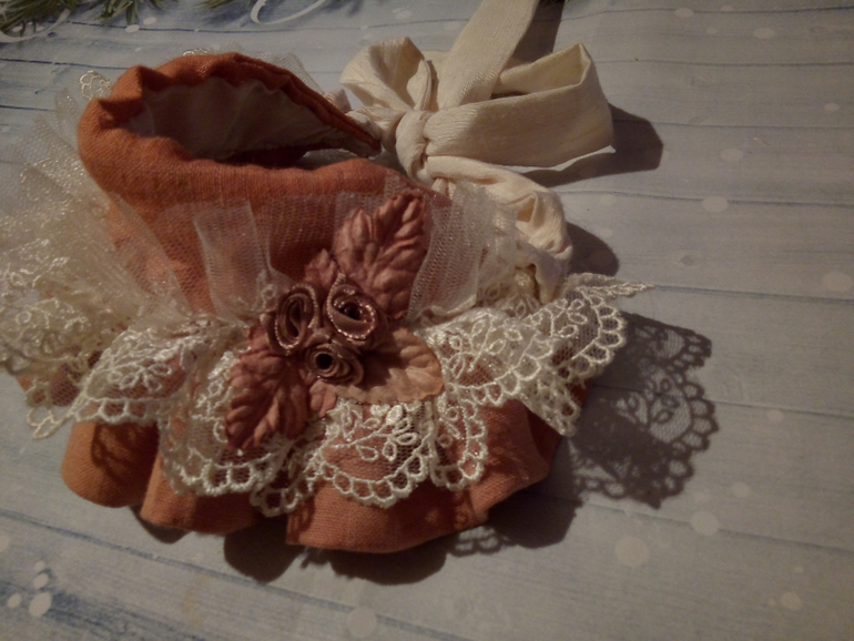 5)Далее пришиваем завязки,украшаем кружевом,тесьмой ,цветами....-чего душа и фантазия просят