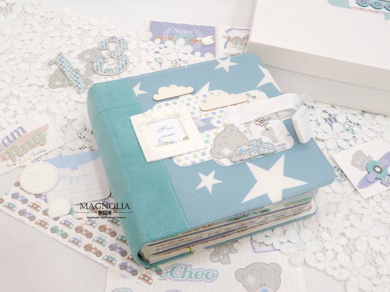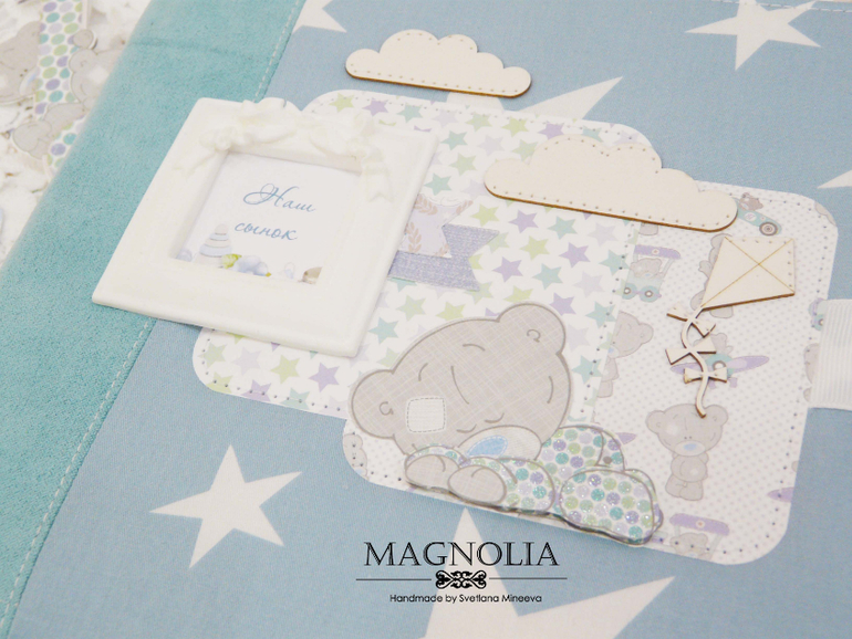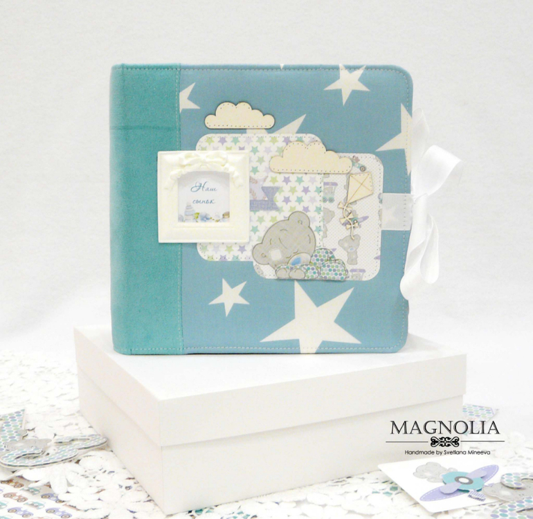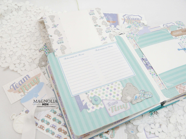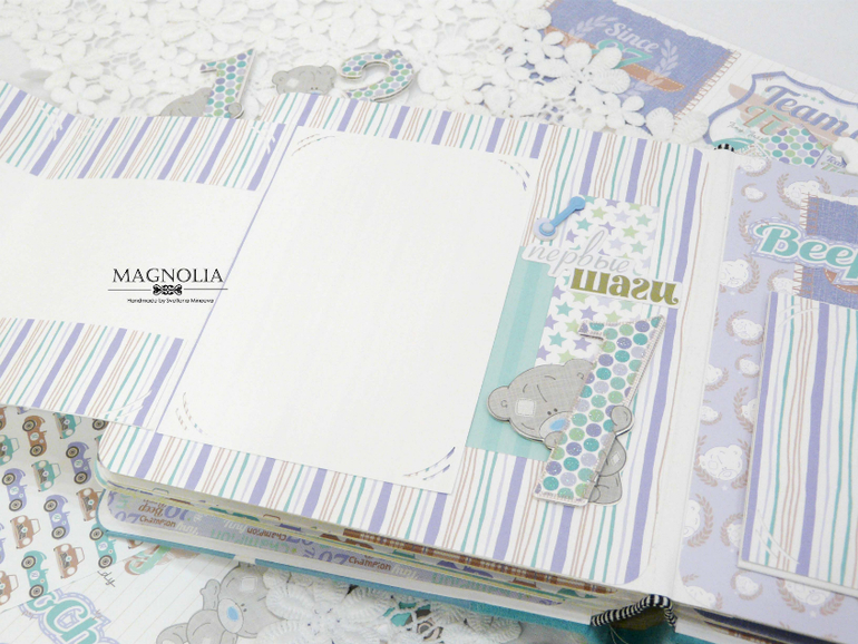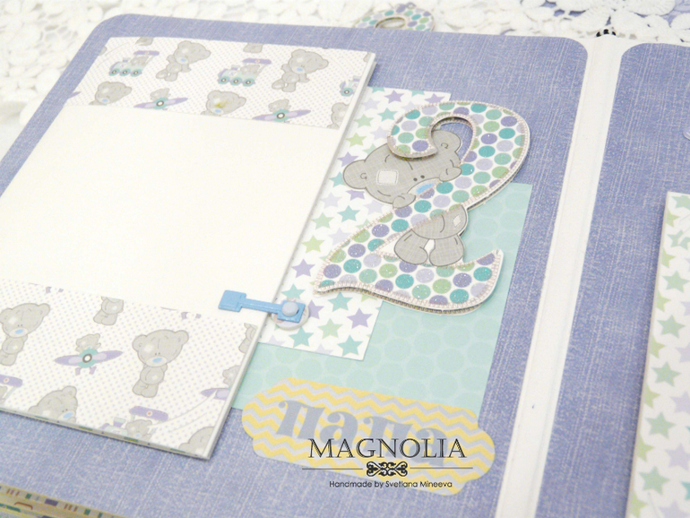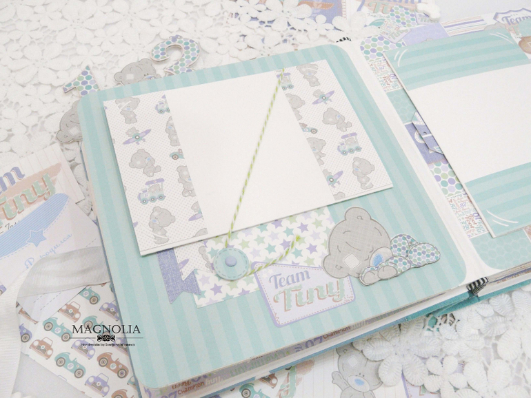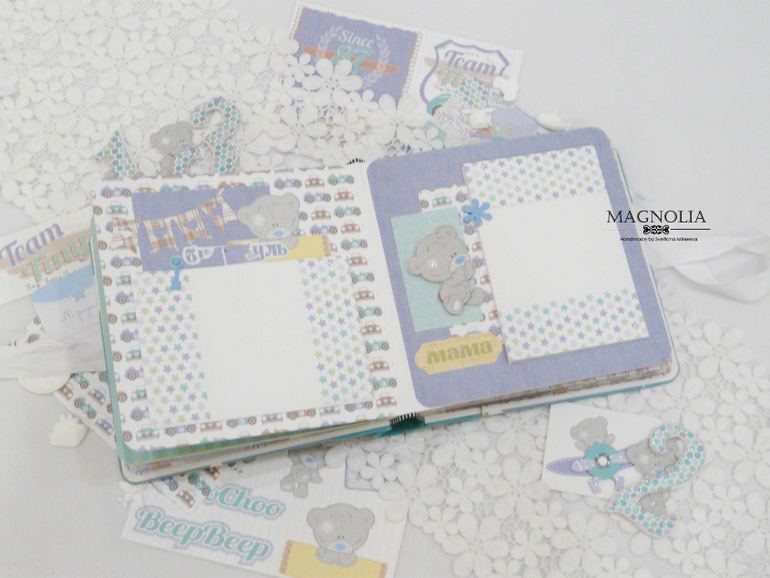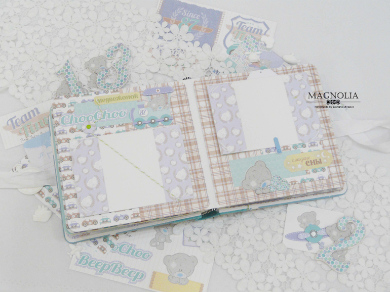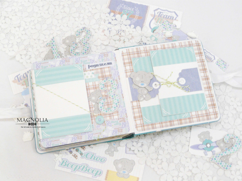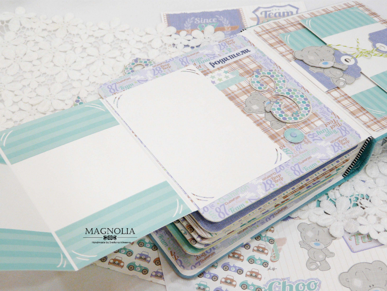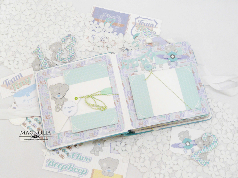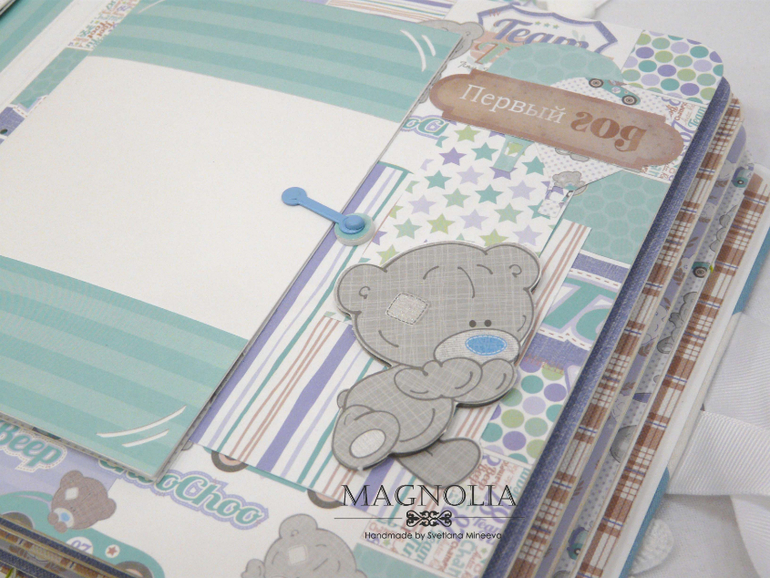 В бирюзовой альбоме для мальчика мишка Тедди главный персонаж, он размещен и на обложке, и на всех страницах альбома.