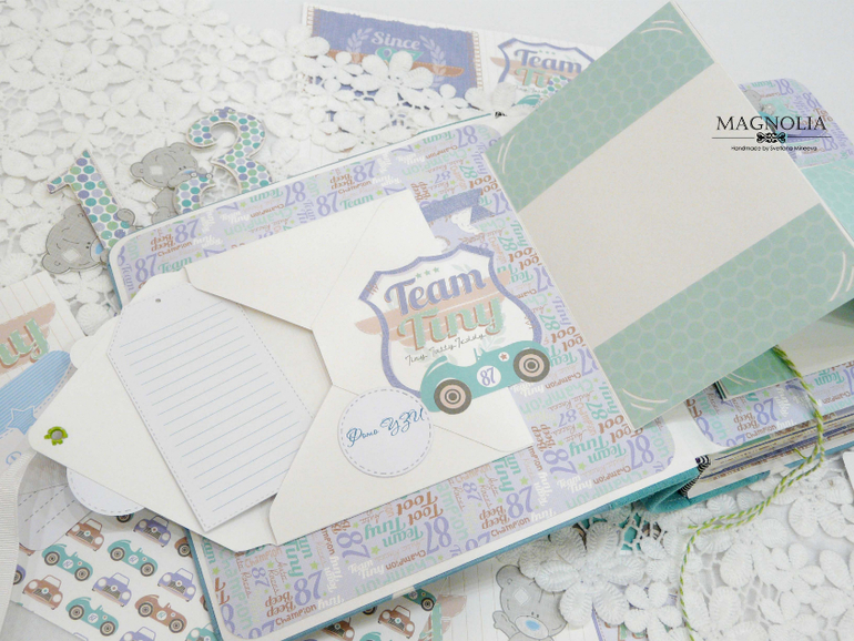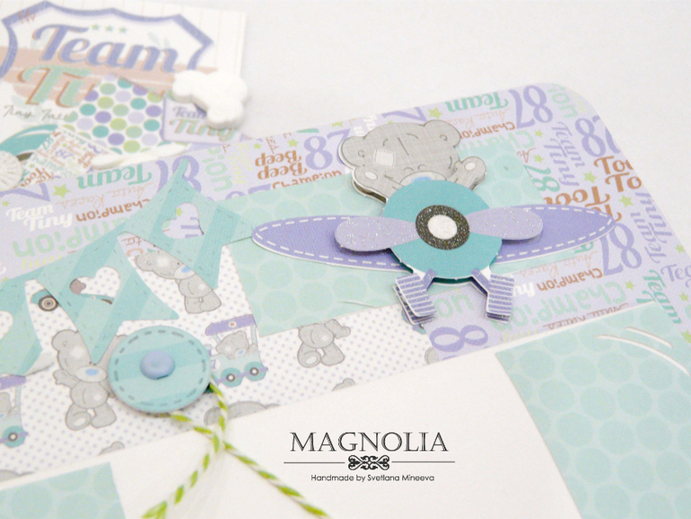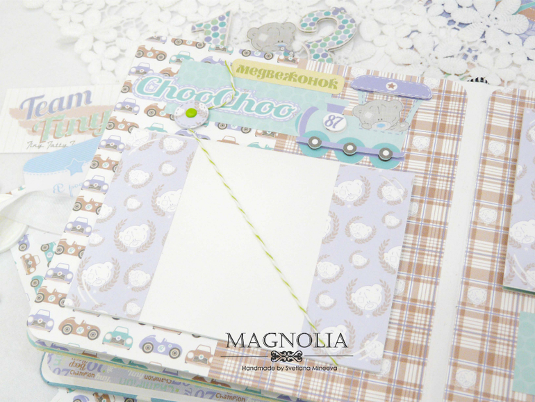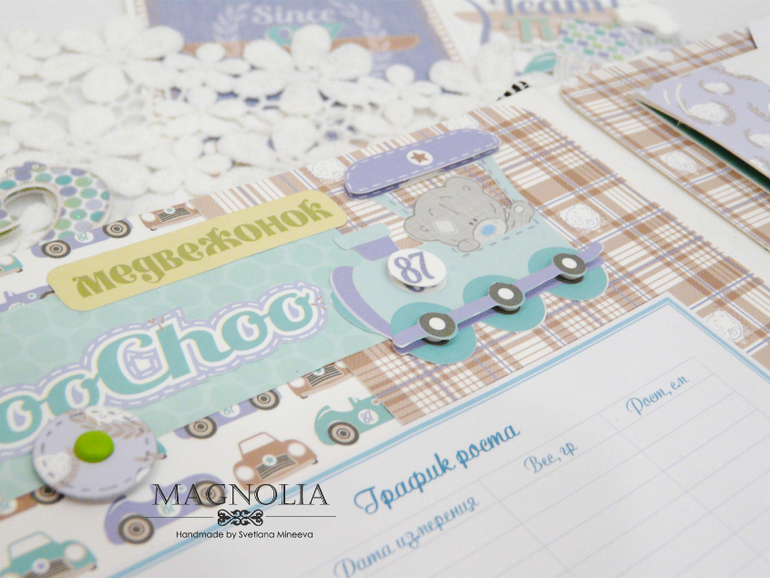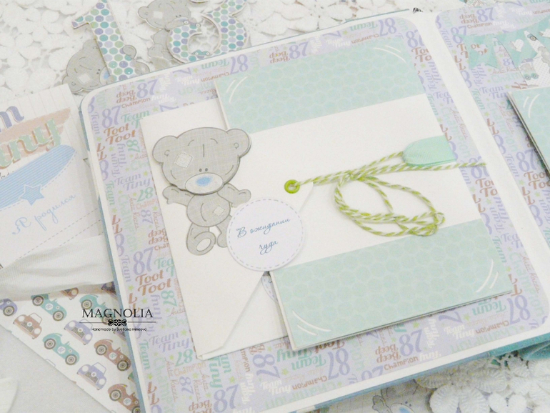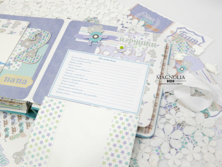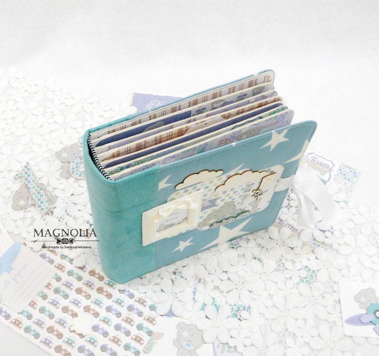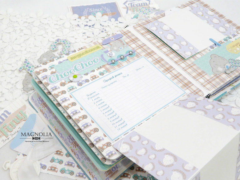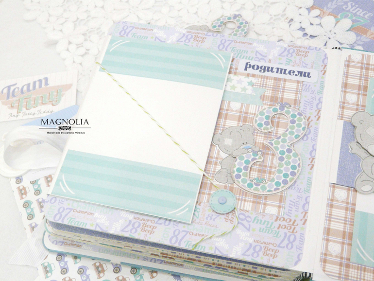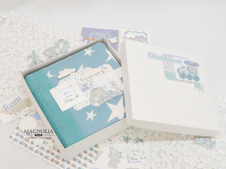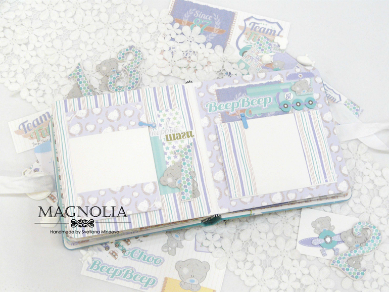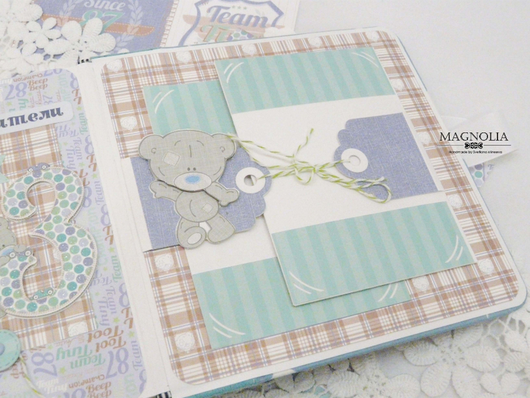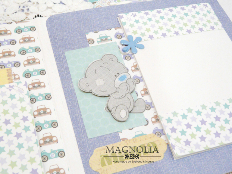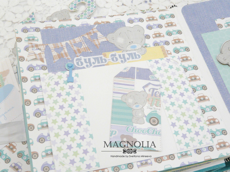В бирюзовой альбоме для мальчика мишка Тедди главный персонаж, он размещен и на обложке, и на всех страницах альбома.