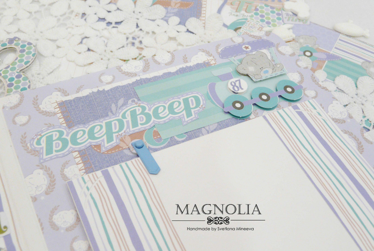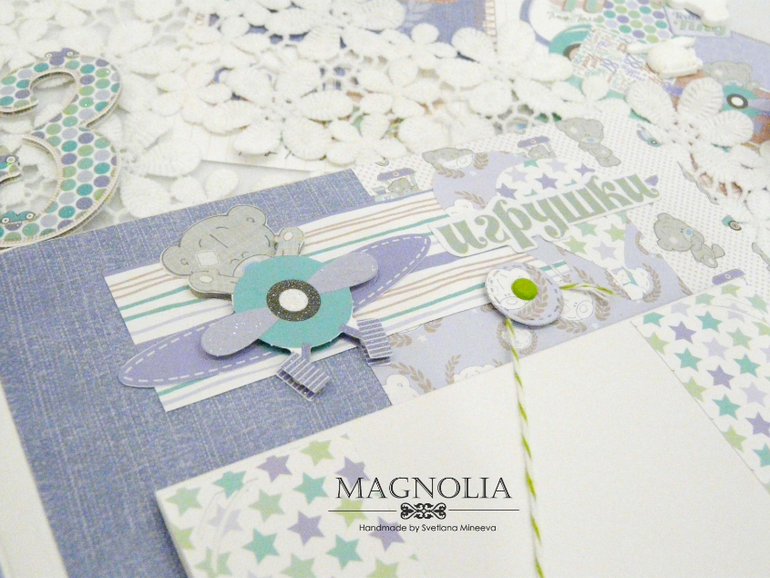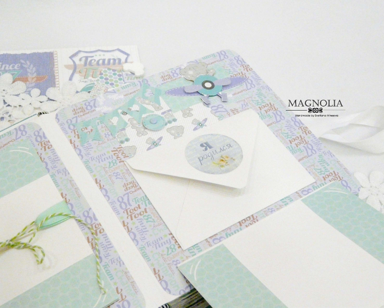 В основе альбома объемный переплет, т.е. между страницами есть зазор, пространство, благодаря чему на страницах можно размещать объемные украшения