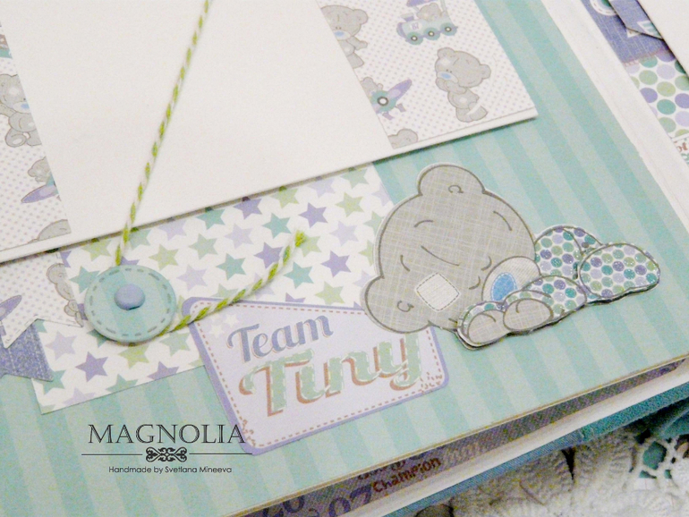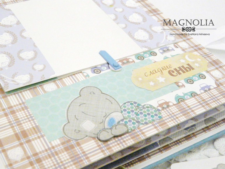 На обложке пластиковая рамочка с надписью, немного объемного декора и спящий мишка Тедди