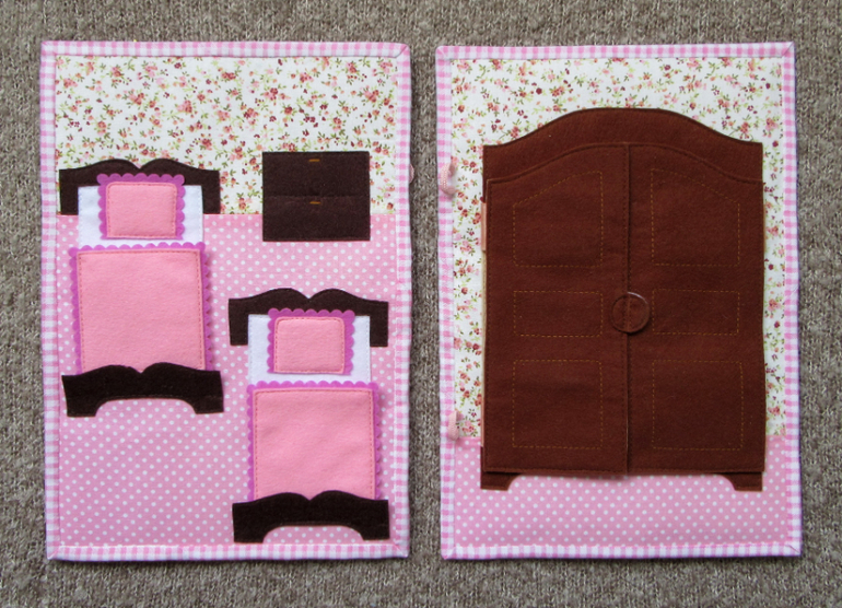 В мягкой книге 5 листов (а это значит 10 страниц, включая обложки) и 4 тематических разворота. Размер - формат альбомного листа(А4). В книге использованы различные материалы: флок, фетр, хлопок, флис. А так же ленточки. шнурочки, замочки, пуговки, кнопочки и липучки.