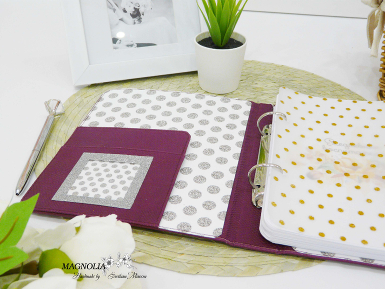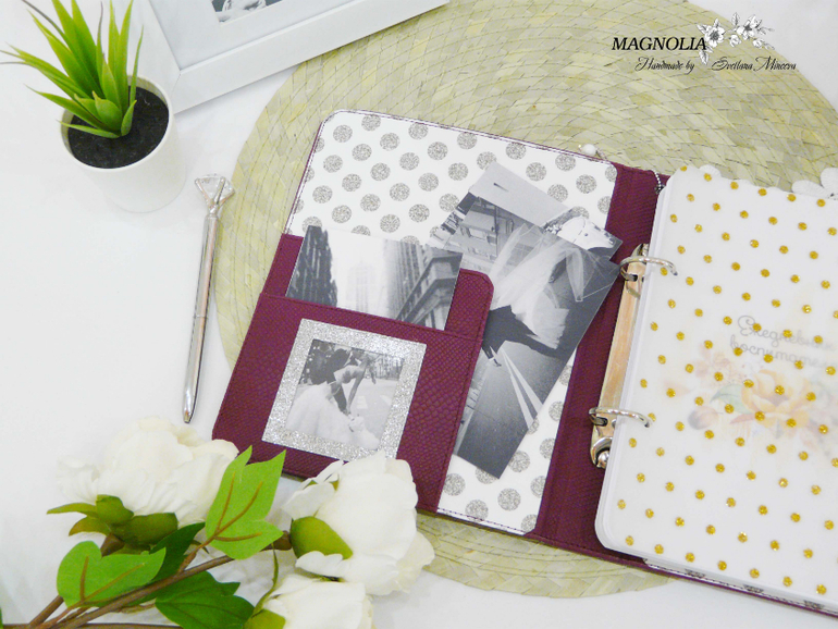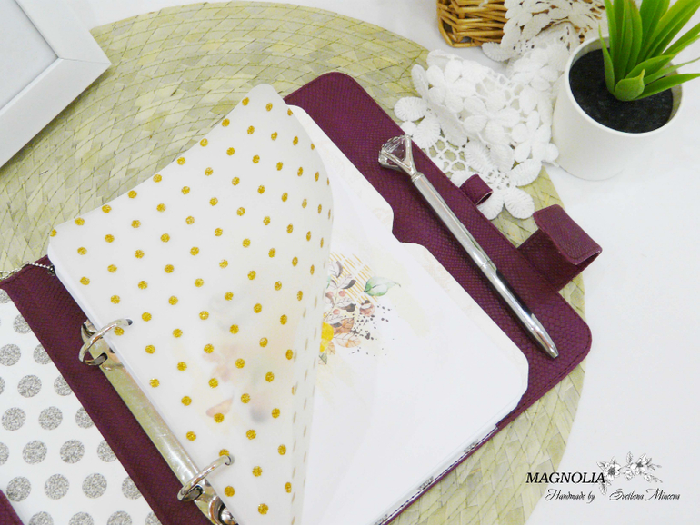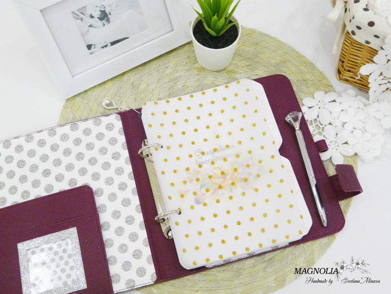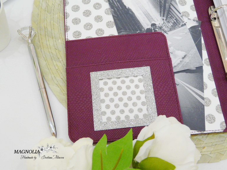 Внутри на обоих форзацах кармашки из кожзама, один даже с прозрачным окошком :) Для красоты добавлен лист кальки с декоративным глиттерным рисунком мелкий горох, еще есть два разделителя с табами из скрапбумаги