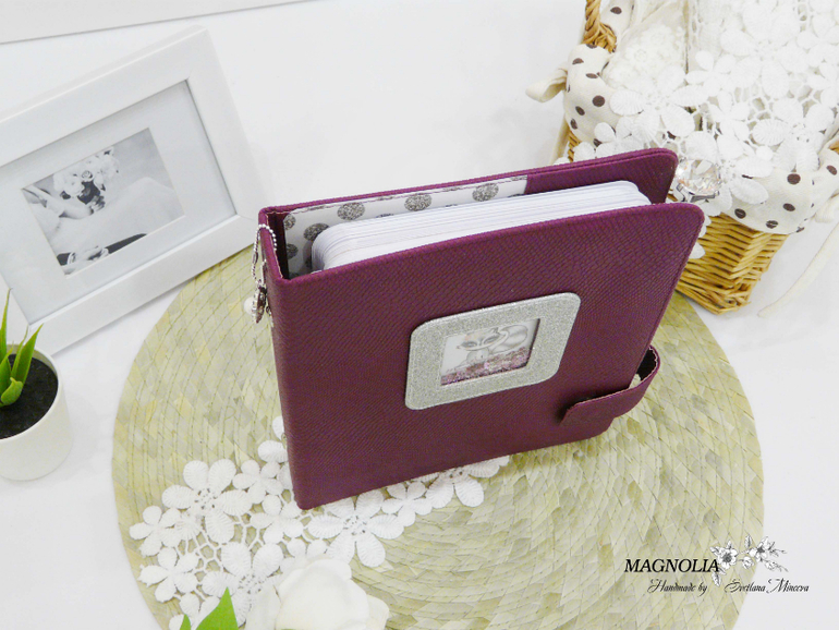 Формат 17*23 см, а внутри 90 листов (180 страниц) с цветными иллюстрациями Обложка обтянута переплетным кожзамом с тиснением рептилия, сбоку украшена подвеской, на обложке красуется рамочка-шейкер с персонализированной надписью и пайетками внутри.