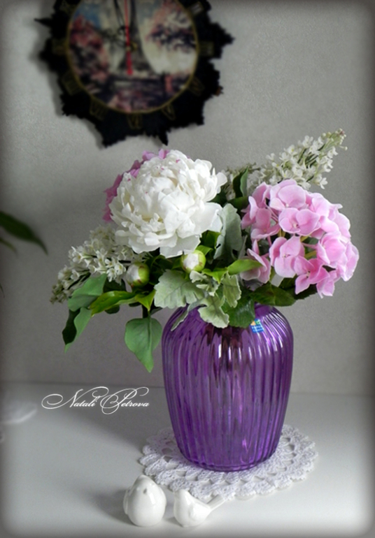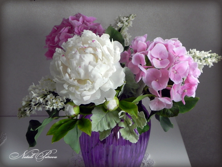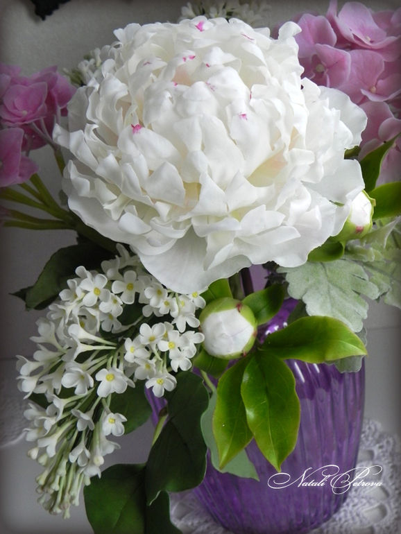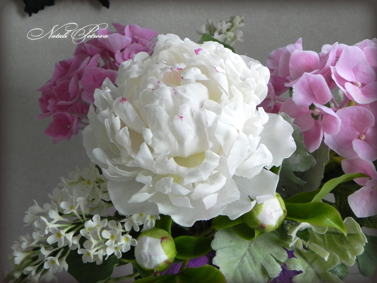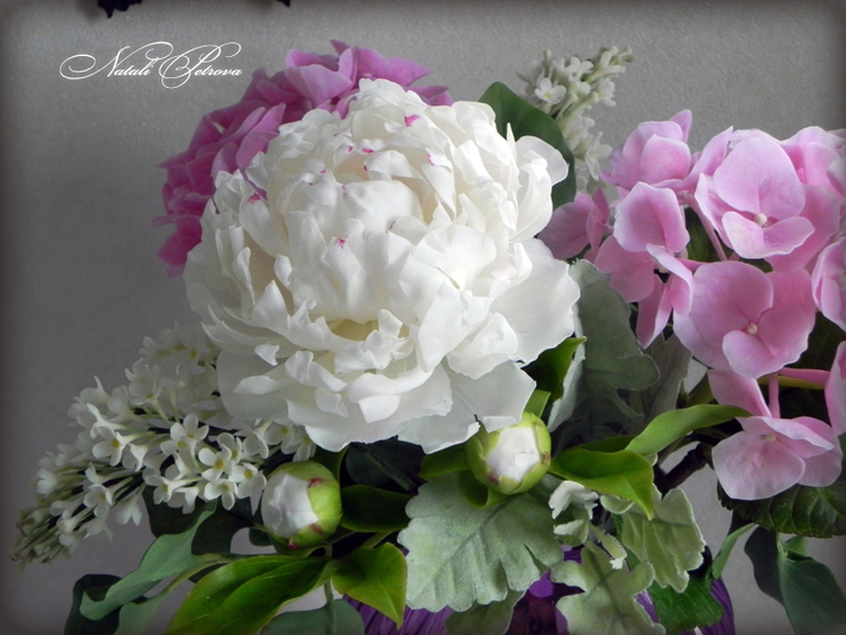Ветка пиона, две ветки гортензии и три ветки сирени из холодного фарфора.