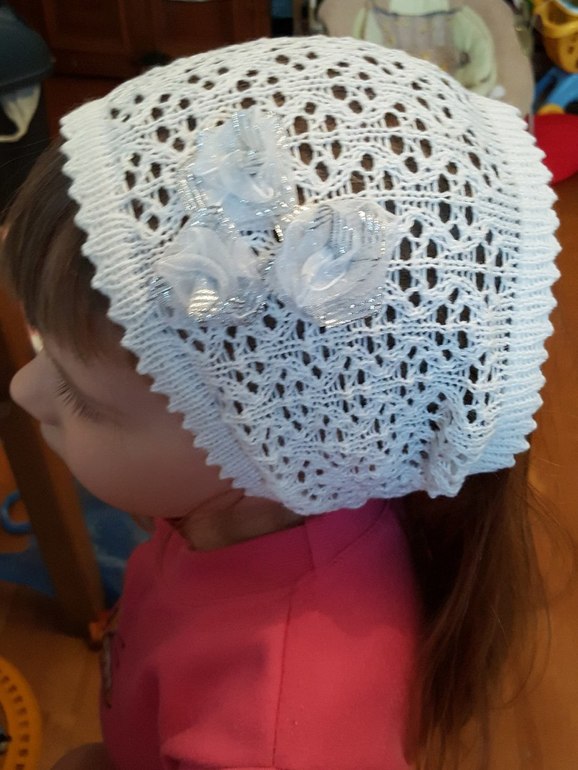 Спасибо! Отдельно вяжите ажурную большую деталь, см. 20 в высоту, и от обхвата головы отнимите сантиметров 10-это набор петель у вас будет и отдельно под резинку связать узкую деталь-см. 5 в ширину-20см, двойную. В неё вставляете резинки, и потом эту резиночную детальку вшиваете в ажурное полотно.