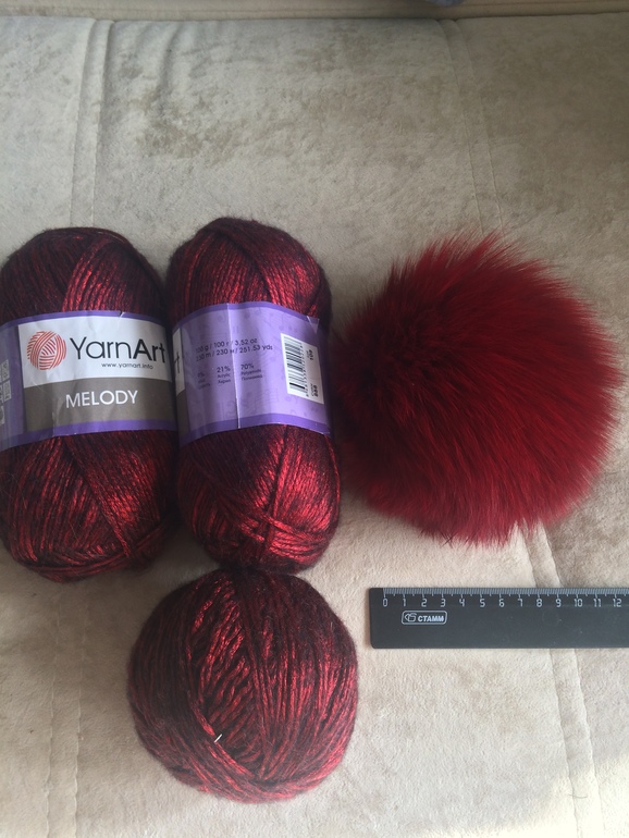 2 мотка Мелоди и чуть больше мотка в клубке. Натуральный большой меховой помпон.