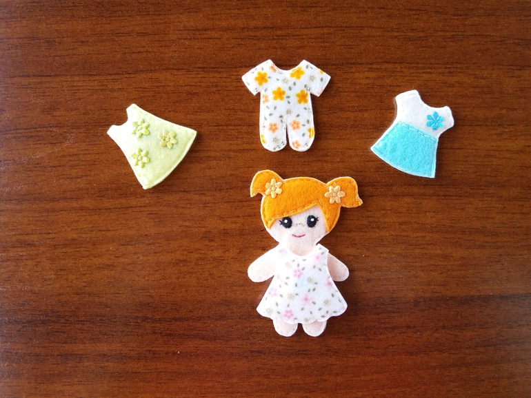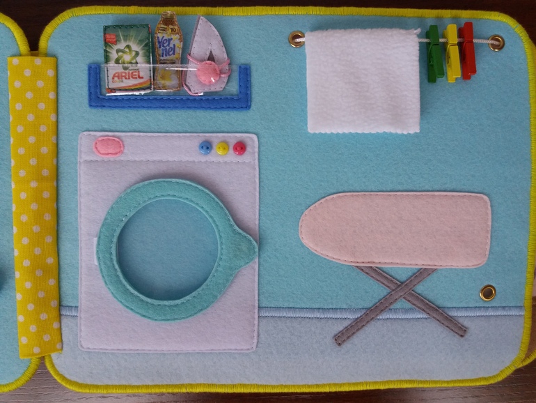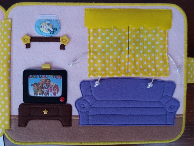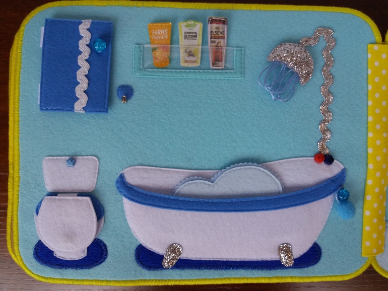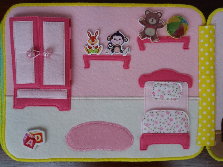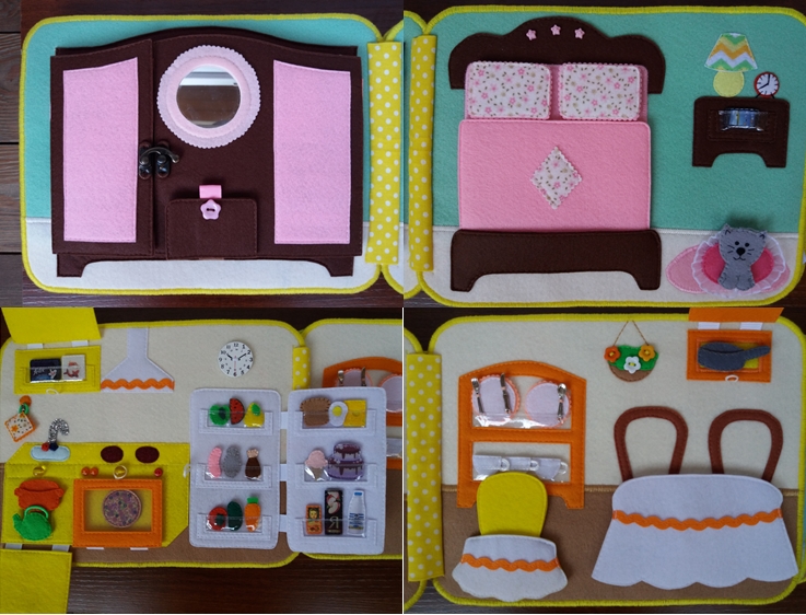 ФетрДобрый день! Хочу показать Вам большой кукольный домик " Семья". В книжке 4 разворота: гардеробная-спальня, кухня-столовая, ванная-прачечная, детская-гостиная. Куколки размером 13, 12 и 6 см. Куколок можно кормить, наряжать, купать, укладывать спать и водить на прогулку. Одежда крепится на магнитах. Домик размером 23,5×18×6 см. В книжке очень много съемных деталей.