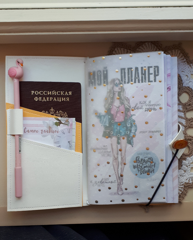 СкрапбукингДоброго дня. Девочки! Что-то я давно не выкладывала работ, не успеваю. Это уже 4 мой планер такого типа. Практичная обложка из кожзама, закрывается на резинку, 3 сменных тетрадочки для записей,на переднем форзаце можно хранить документы, на заднем-карточки. Плюс вместительный карман на молнии для купюр и телефона. Удобная вещица на лето!