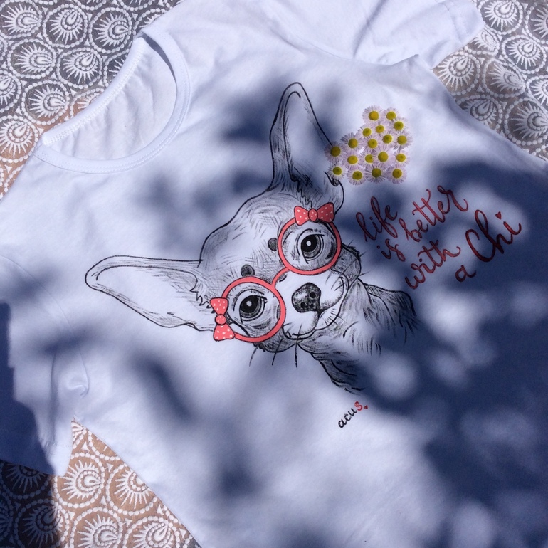 Роспись по ткани, батикДобрый день! Сегодня я с футболочкой для спортсменки и просто красавицы Викуси. С ее любимой собачкой.