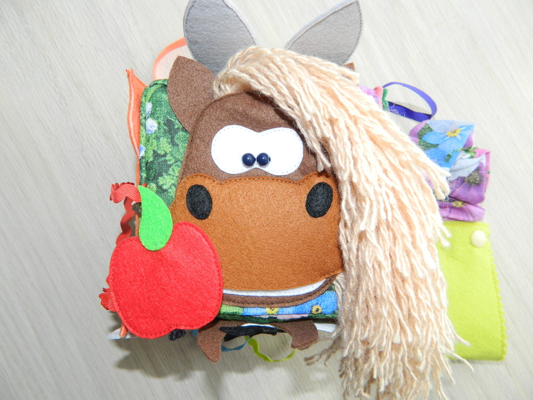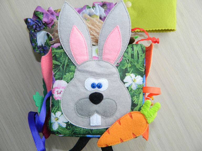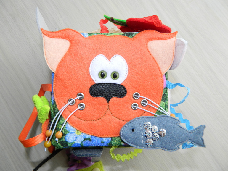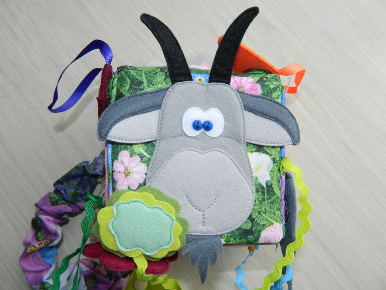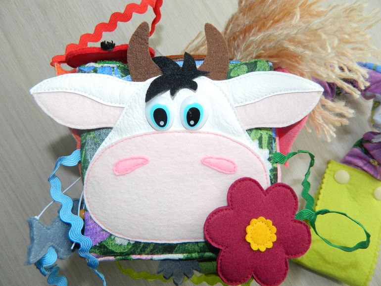 Развивающие игрушкиРазвивающий кубик "Кто, что ест" с креплением для коляски или кроватки, размер 10х10 см., сшит по выкройкам Татьяны Жуковой. Съемные детали на ленточках, к граням крепятся на липучки.