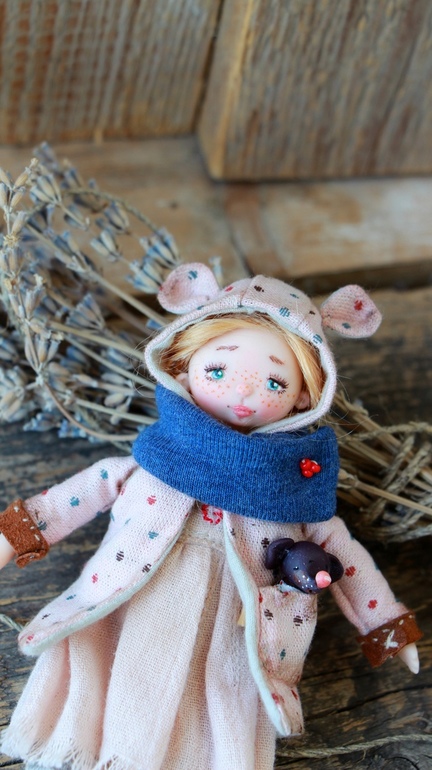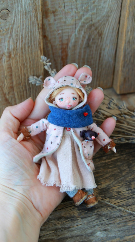 Кукольный мир - человекоподобные куклыЕё зовут Мышка).. Нежная малышка в смешанной технике. Головка, ручки, ножки из фимо. Тельце текстильное.Личико расписано акрилом и маслом. Волосы -локоны козочки. Одета в платьице из жаточки с вышивкой, хлопковые панталошки, пальтишко с ушками.Обувка из натуральной замши. Одёжка вся снимается. В кармашке живёт друг).. Ростик около 10см.