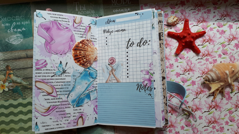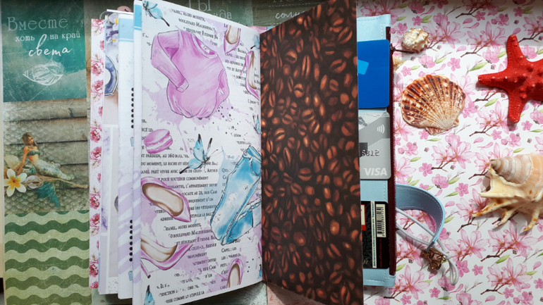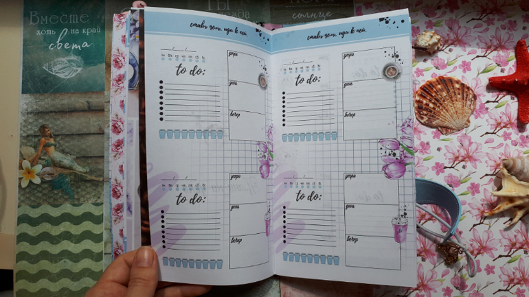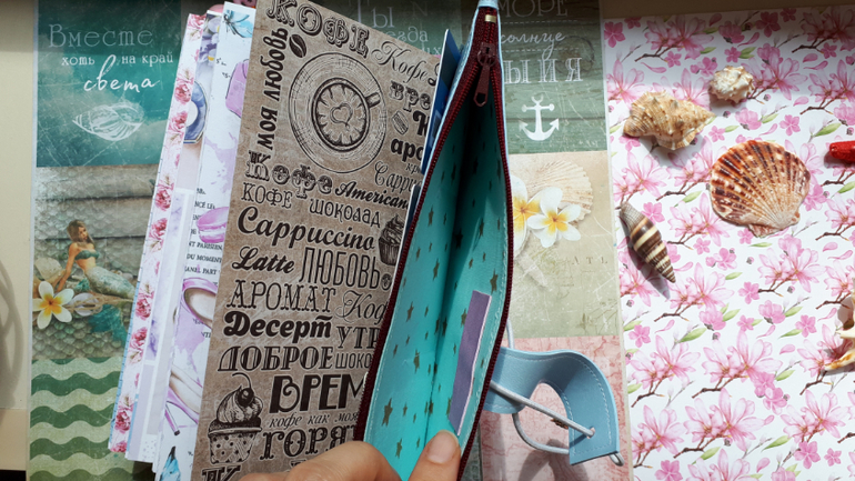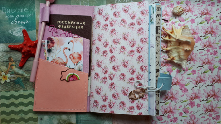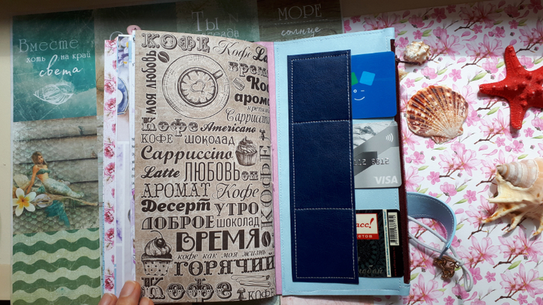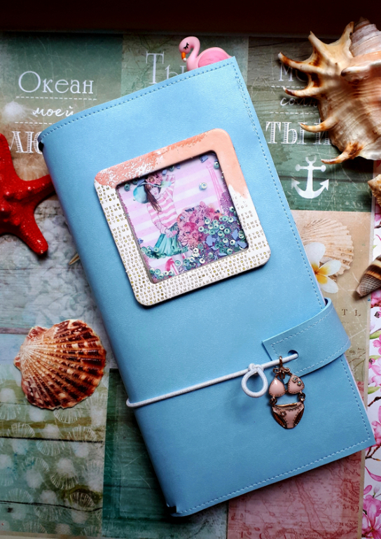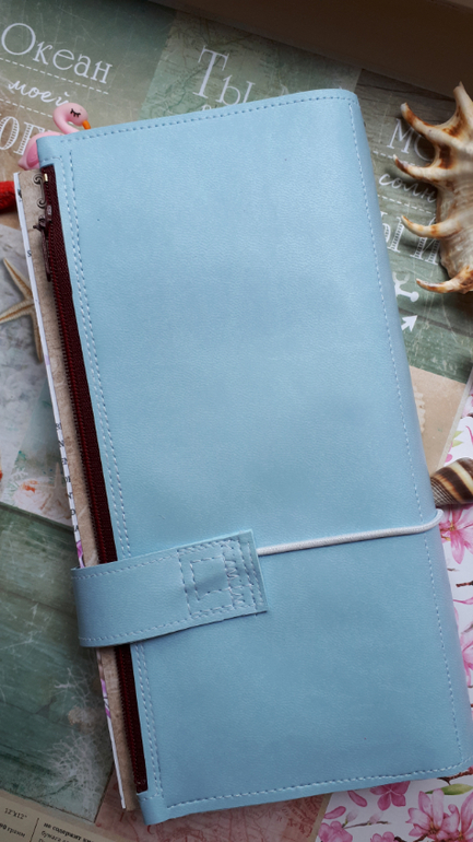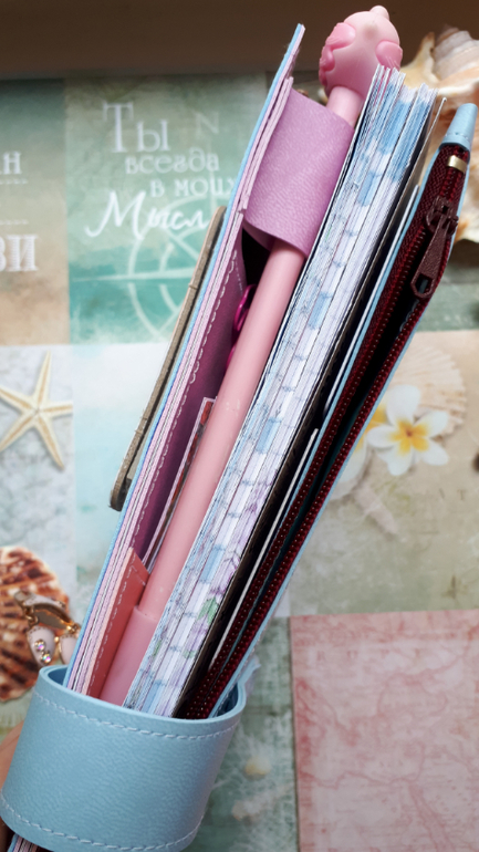 В обложечке из кожзама цвета неба))С шейкером на обложке, закрывается на резинку, украшен подвеской-купальником. Что же внутри? 3 сменных тетрадочки, для удобства можно вытащить, записать, а можно прямо в блокнотике писать. Странички дизайнерские, очень красивые, с интересными разделами, планирование на год, понедельное планирование и многое другое. На форзацах карманы для документов и карточек. Есть наклейки, карточки-закладки, декоративные скрепки. И Большой карман на молнии для купюр или телефона.