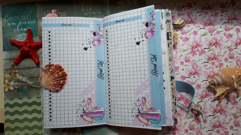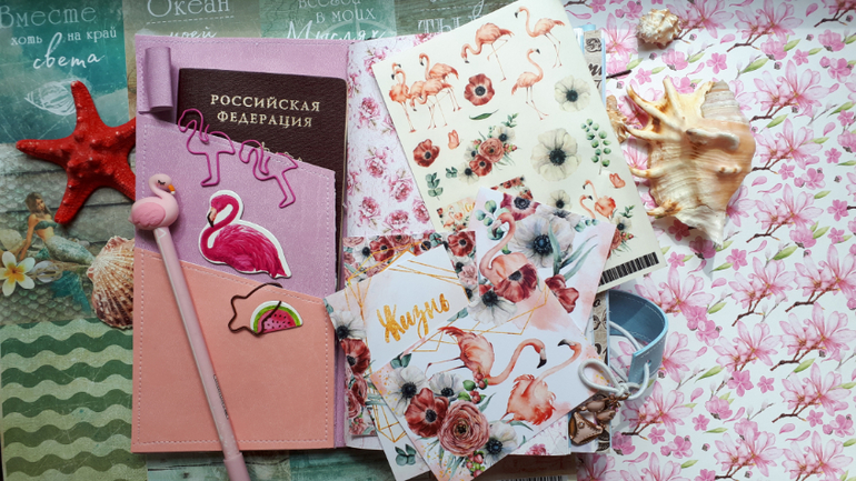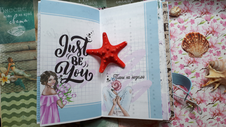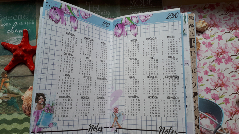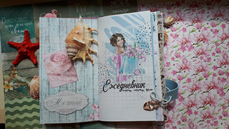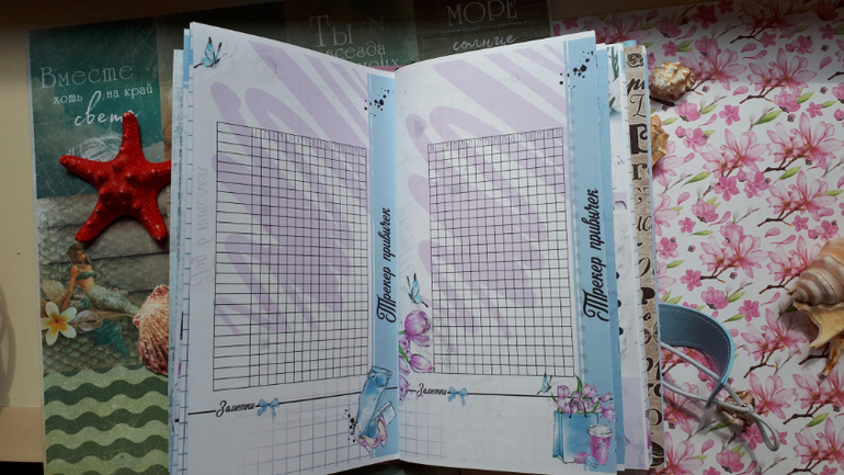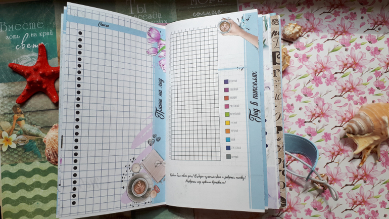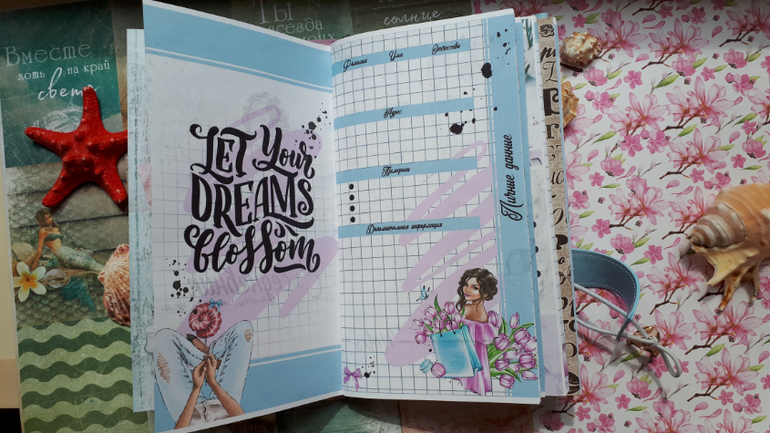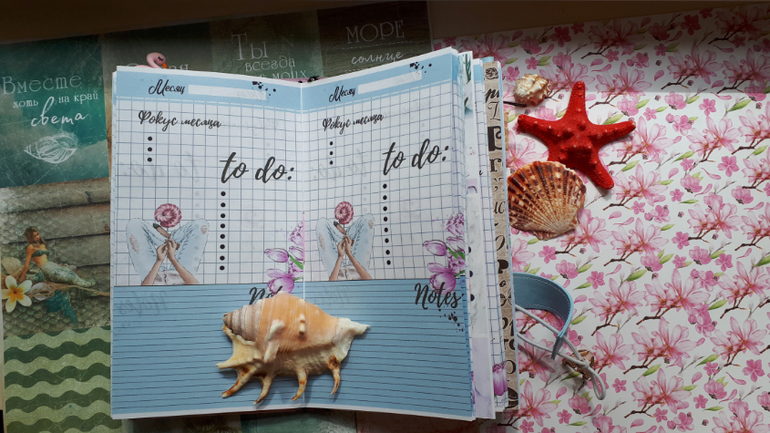В обложечке из кожзама цвета неба))С шейкером на обложке, закрывается на резинку, украшен подвеской-купальником. Что же внутри? 3 сменных тетрадочки, для удобства можно вытащить, записать, а можно прямо в блокнотике писать. Странички дизайнерские, очень красивые, с интересными разделами, планирование на год, понедельное планирование и многое другое. На форзацах карманы для документов и карточек. Есть наклейки, карточки-закладки, декоративные скрепки. И Большой карман на молнии для купюр или телефона.