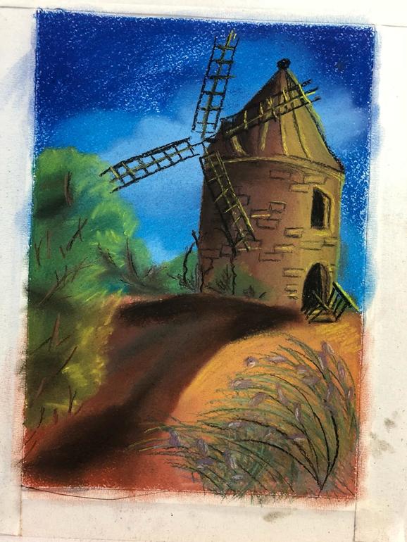 Пастели в наборе было еще не очень много. Особенно на небо, пользовалась теми, что было. Фиолетового тоже не было, цветочки не яркие.