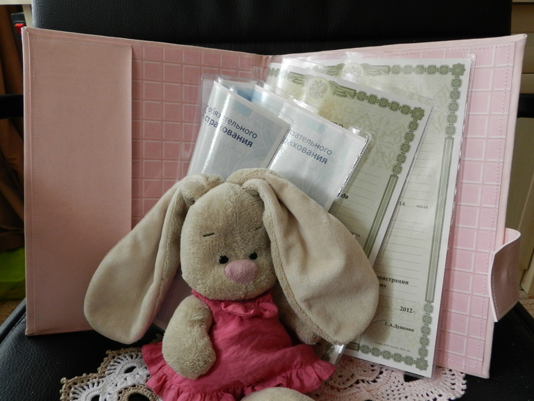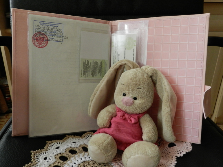Внутри вкладыши для документов на 2 комплекта: сниилс, полис, свидетельство о рождении.