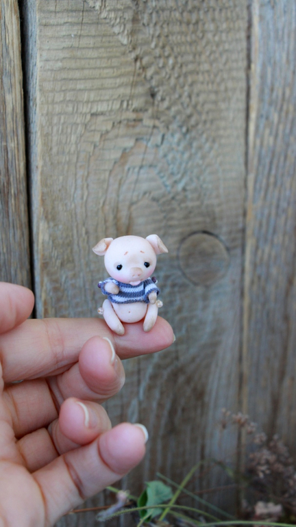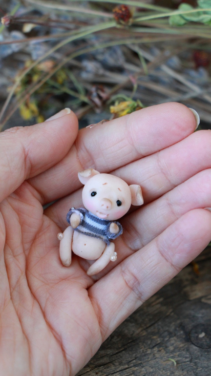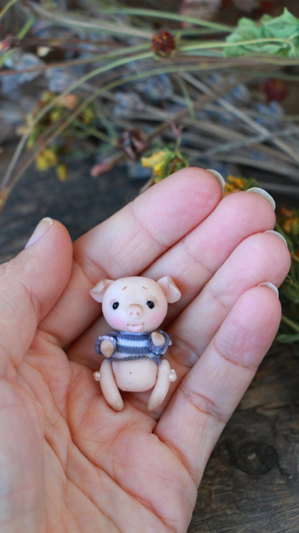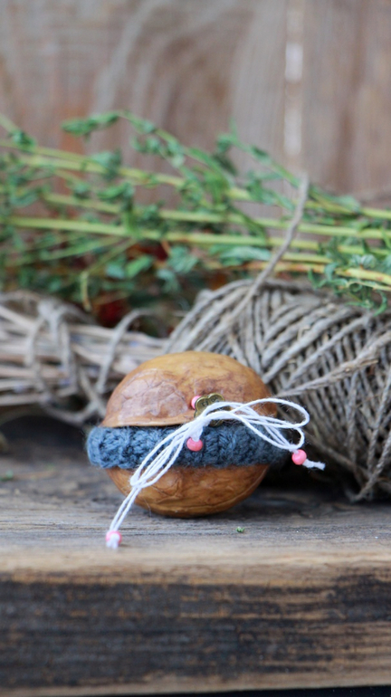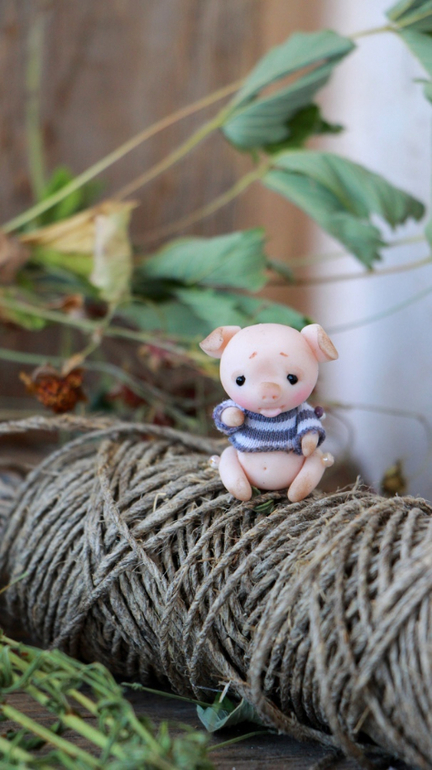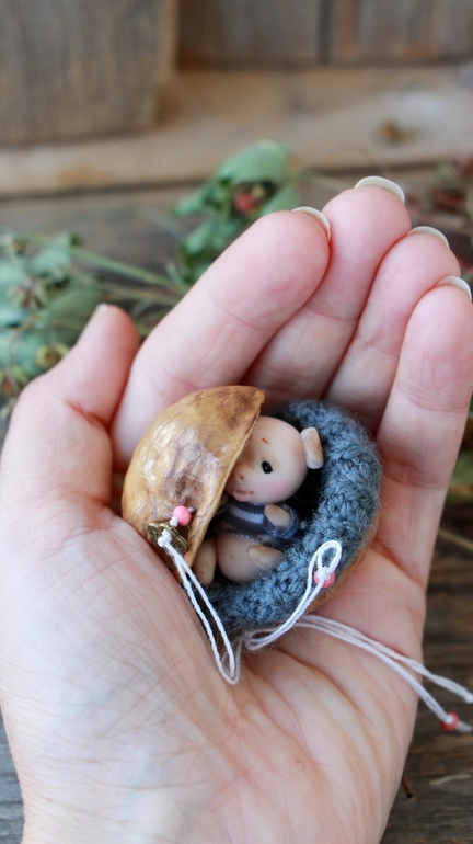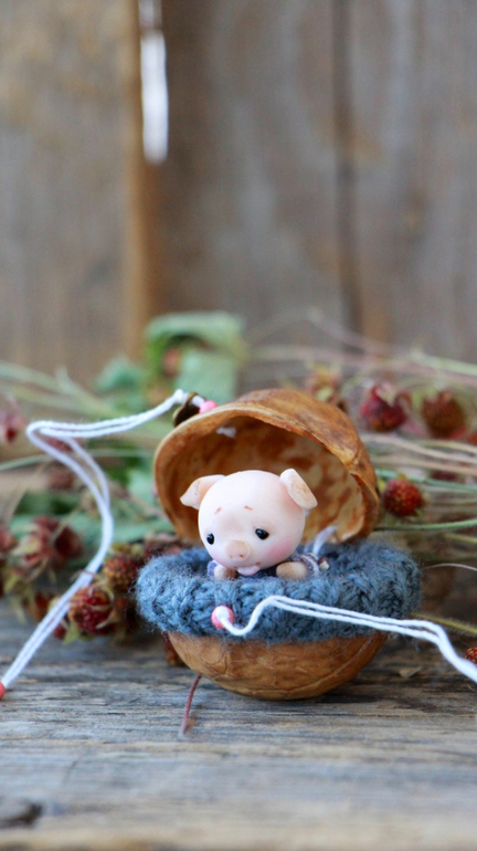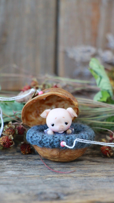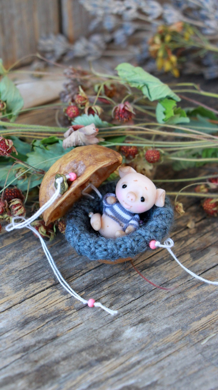 Игрушечный мир - животныеДоброе утречко! Я к вам с поросёночком. Малыш хрюник слеплен из фимо. Живёт в грецком орешке. Мягонький чехол связан спицами.,орешек отшлифован изнутри, затонирован и покрыт лаком. Закрывается, чтобы малыш мог подремать в тишине).