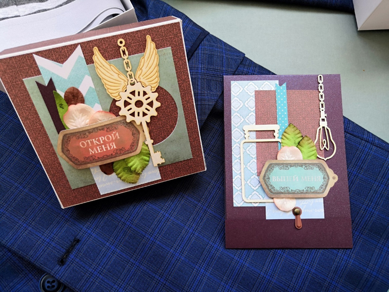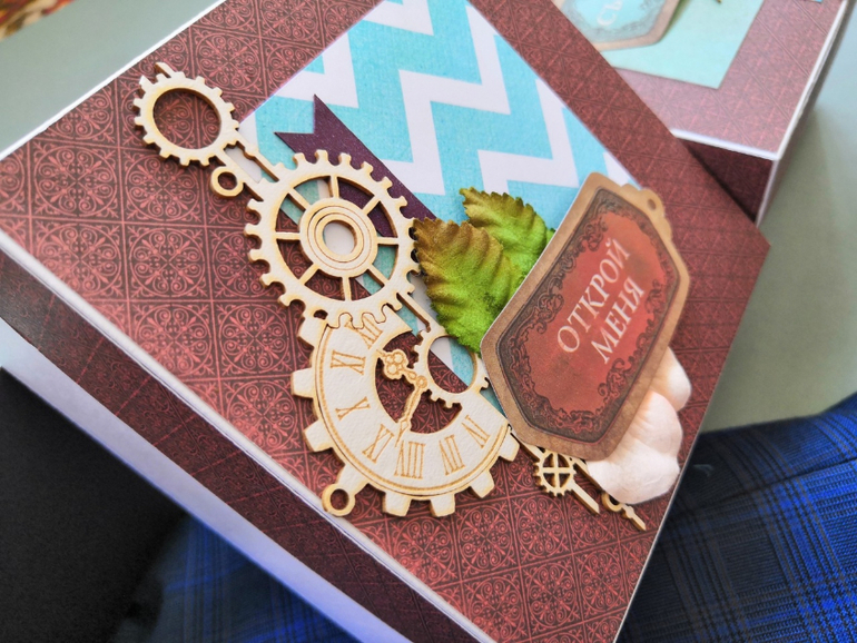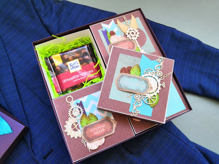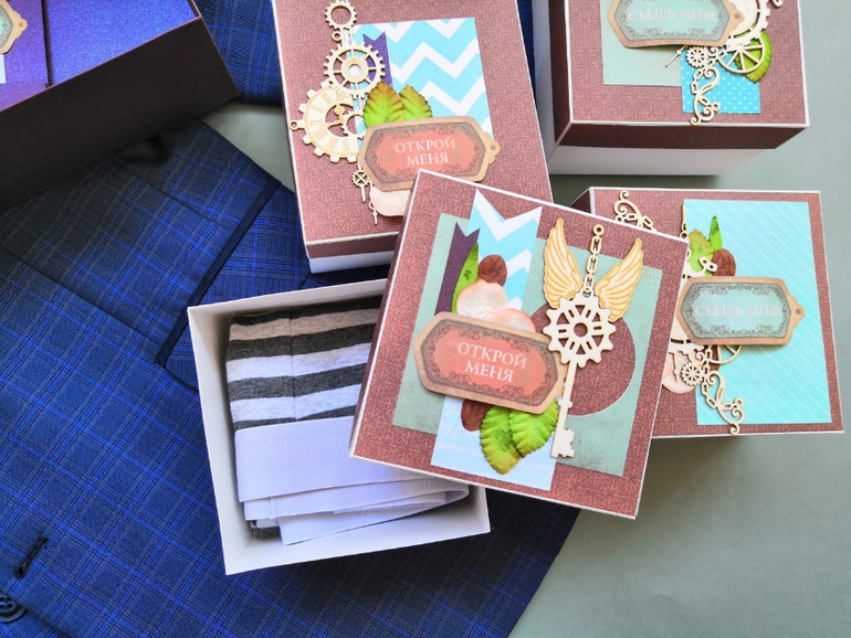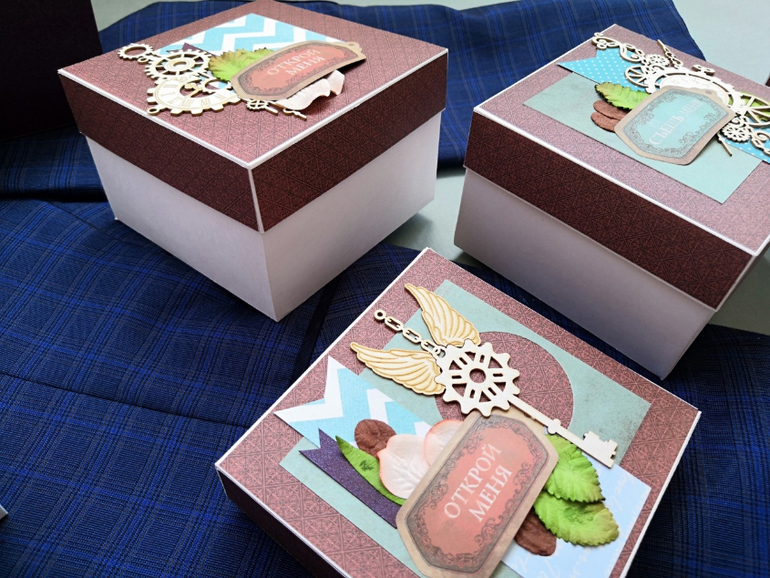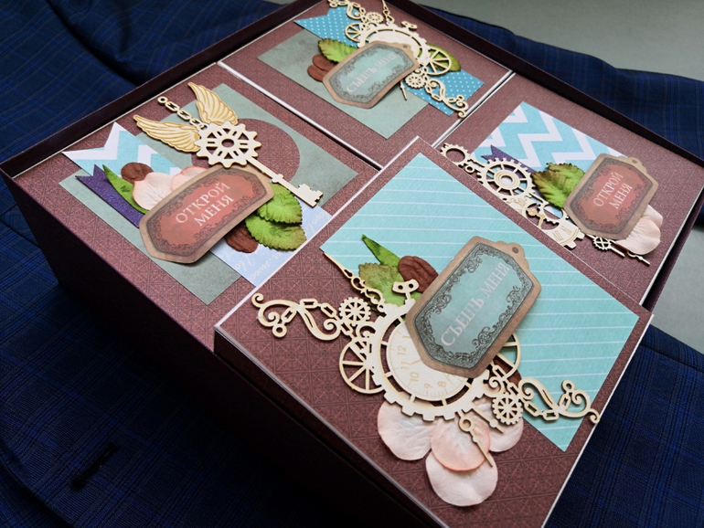 СкрапбукингБольшая коробка внутри которой находятся коробочки поменьше, в каждой из которой находится символический подарочек, а под ними сертификат в оформленном конверте.