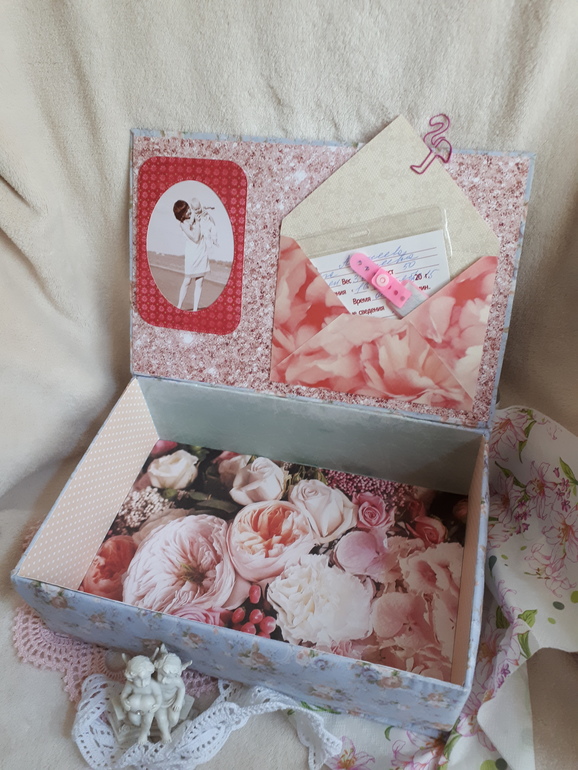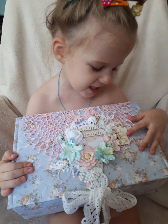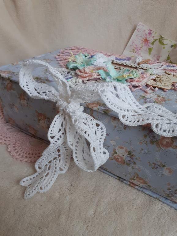 Коробочка ооооочень вместительна 28х19х9. Я туда даже крестильное платьюшко уместила) Станет прекрасным подароком..Часто ведь ломаем голову, что подарить на рождение малыша..Этот подарок останется на долгие годы и станет украшением детской комнаты. Коробочка украшена кружевами ручной работы. Внутри есть рамочка для фото и кармашек, куда можно спрятать бирочки или снимки УЗИ.