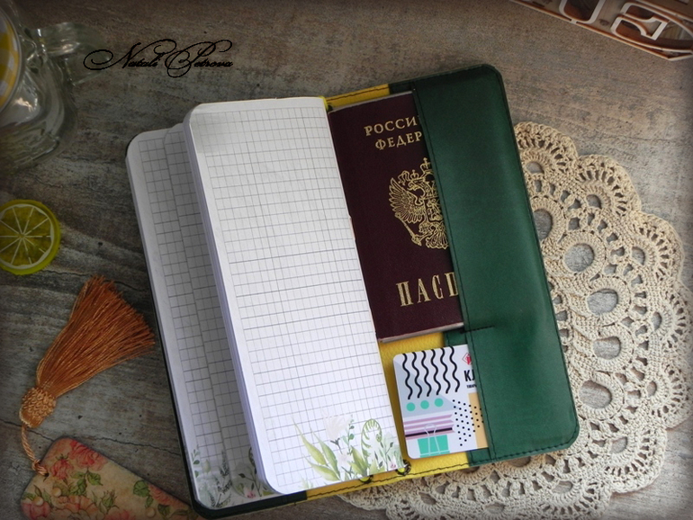 Обложка из переплетного кожзама. На переднем форзаце большой карман, на заднем - два кармана. Один из них большой, другой разделен на два отдела. (под паспорт и под визитку), Внутри помещаются две сменные тетрадки.