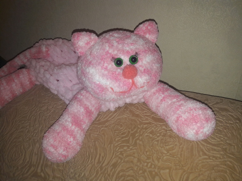 Дочку пригласили на день рождения. Долго думали что подарить, и, т.к. именница любит котиков и розовое сяязалась для неё такая пижамница. Ниточки Ализе софти - 2 мотка и ализе пуффи - меньше 1 мотка.