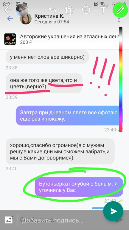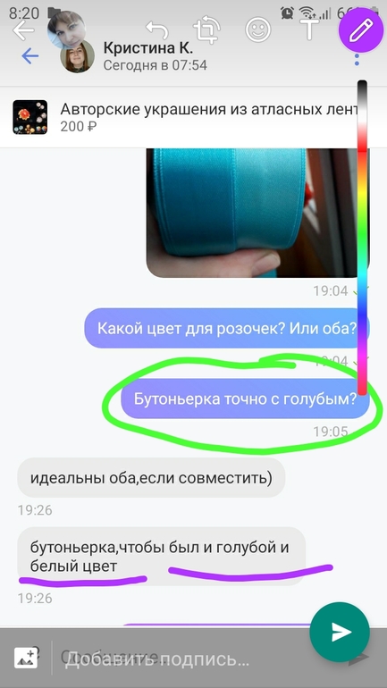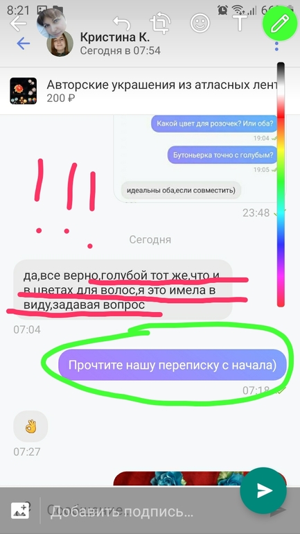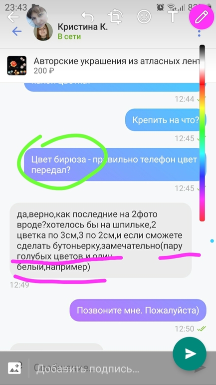 Ничего непонятно в вашей переписке - это раз. И два - для многих людей голубой и бирюзовый - одно и то же. Лучше тыкать фото. Тем более, что не вижу недовольства со стороны клиента