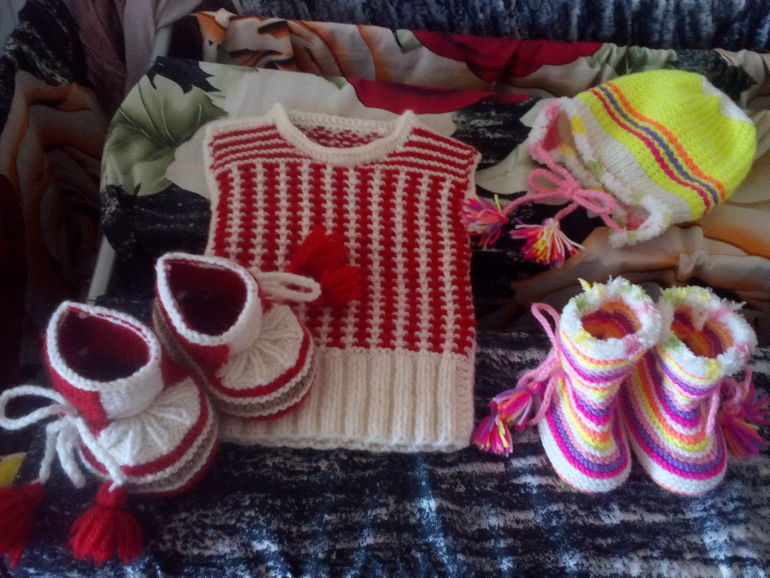 Вязала только спицами,красный комплектик из троицкой пряжи "подмосковная", цветной комплект из Пехорки "детская новинка"