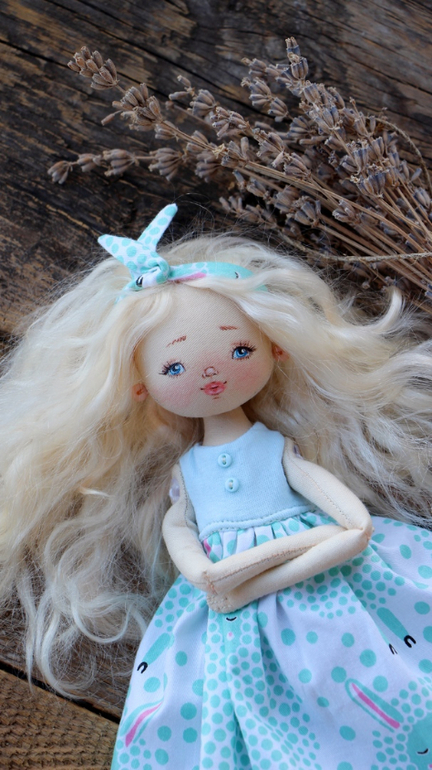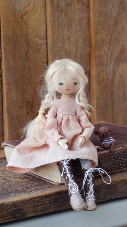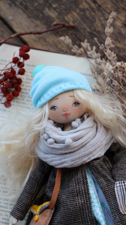 Кукольный мир - человекоподобные куклыДобрый день! Куколка сшита из хлопка.Крепление пуговичное, подвижная...сидит изящно)Волосы локоны козочки, прошиты и проклеены, можно делать причёсочки.Личико расписано акрилом и маслом. Одета в трикотажные колготочки. В гардеробе три платьица из хлопка и жаточки. На ножках обувка из натуральной кожи. На головке шапочка из трикотажа. Шарфик из жаточки.Тёплое пальтишко с кармашком. Есть также солошка и сумочка из натуральной кожи. В ручках лепной дружок Мишаня) Ростик 31 см.