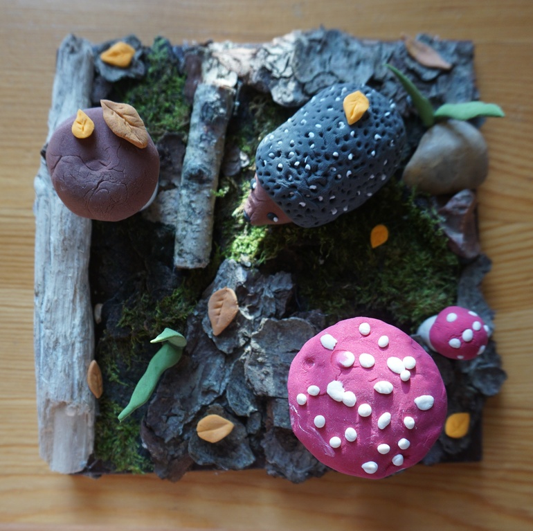 3. В лепке грибов участвовала (перфекционист во мне не дал оставить их слишком кривыми), ёж и листья вообще совсем мои.