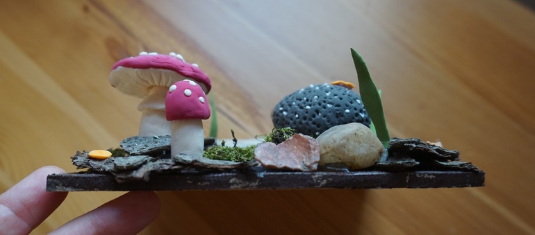 Что делал ребёнок: покрасил основу, клеил крупные элементы, активно участвовал в лепке грибов и травы. Ещё он слепил крупные листья, но семейный худсовет их забраковал.
