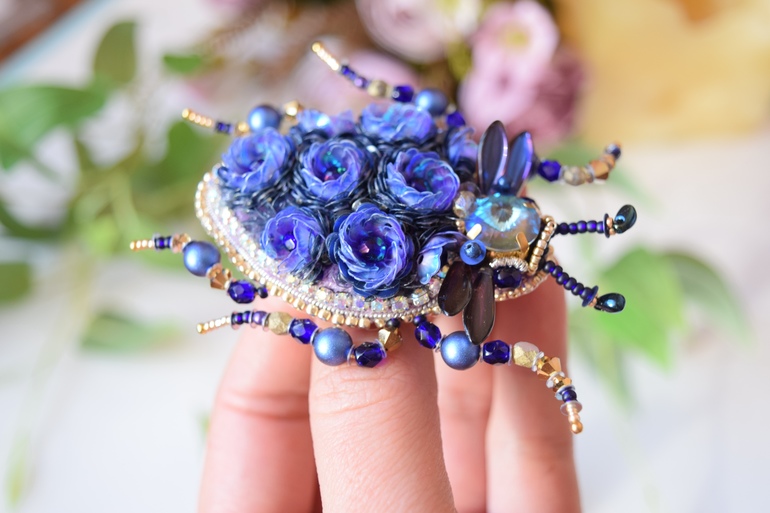 Есть у меня брошь-синий жук. А у мамы зеленый. Захотелось с ней ими поменяться, решила со своим в последний раз в свет выйти, и так жалко его отдавать стало) Я его купила у другого мастера и с этого началось мое увлечение брошами. Но мама же уже ждет синего жука. Пришлось сделать ей в спешном порядке) Вот что вышло: