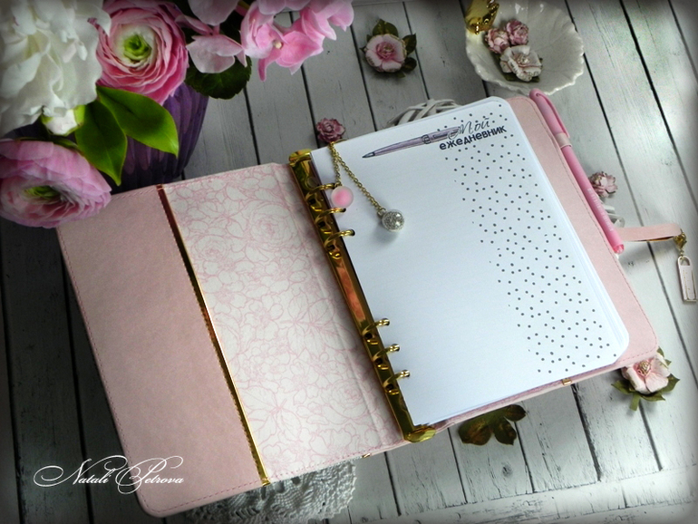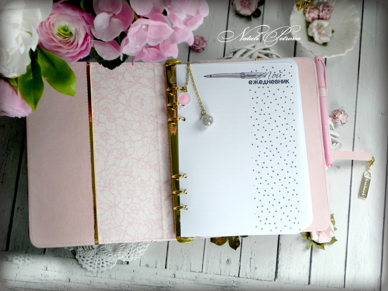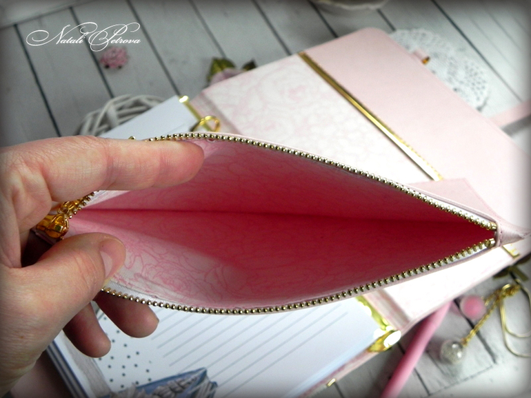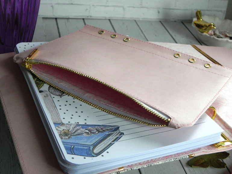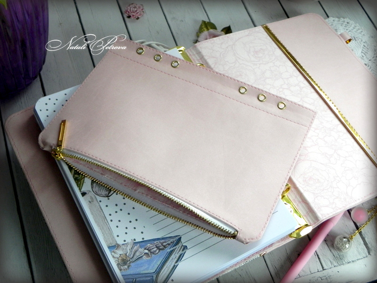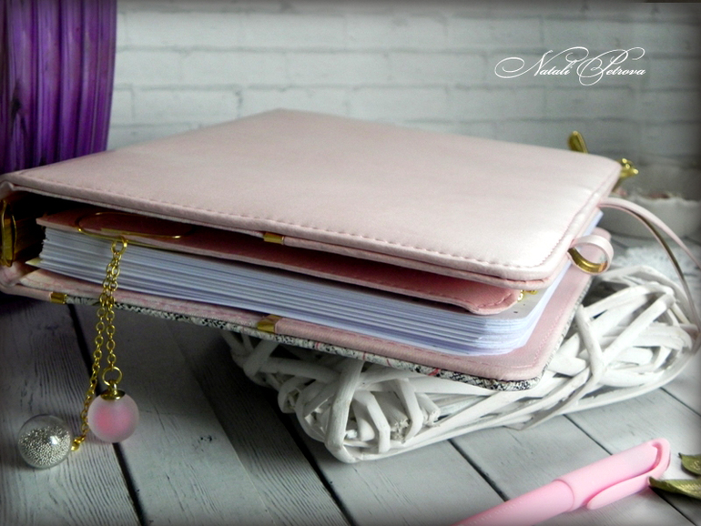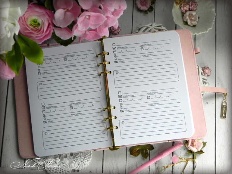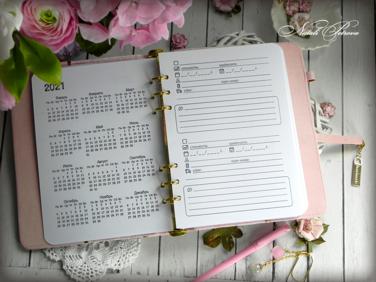 Представляю вашему вниманию ежедневник для записи заказов. Размер А5, блок на кольцевом механизме. Обложка очень мягкая, приятная на ощупь. Обтянута двумя видами кожзама (обычный с тканевой подложкой и переплетный), внутренняя часть - американским хлопком. Кармашки, стык на обложке, хлястик и петелька для ручки укреплены золотой термотрансферной пленкой. Ежедневник дополнен закладкой-скрепкой с украшением на цепочке и пеналом на молнии для хранения квитанций с номерами треков. Блок напечатан на бумаге премиального качества. Гладкой, шелковистой на ощупь плотностью 120 мг/кв.м, поэтому записи на ней не будут просвечивать.