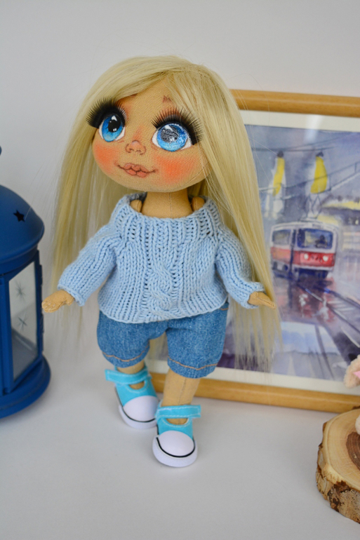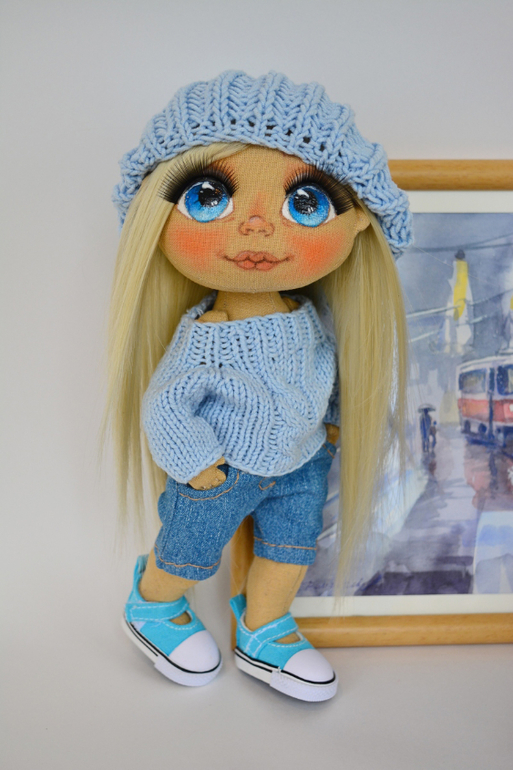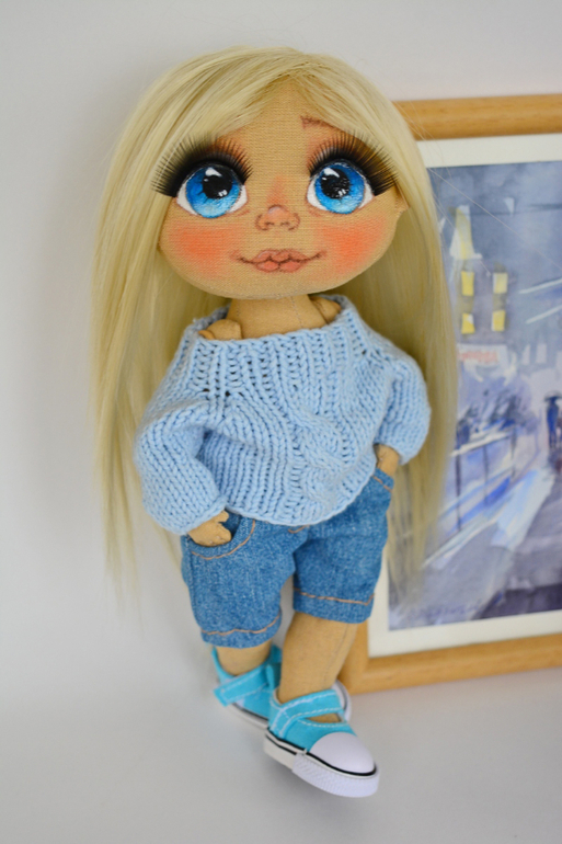 Кукла текстильная, интерьерно-игровая. Рост 25 см. Стоит, сидит самостоятельно. Ручки сгибаются и фиксируются в любом положении.