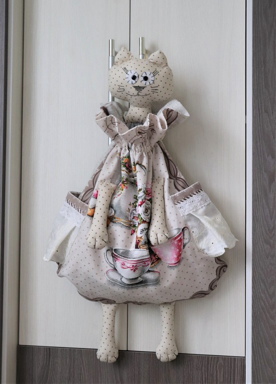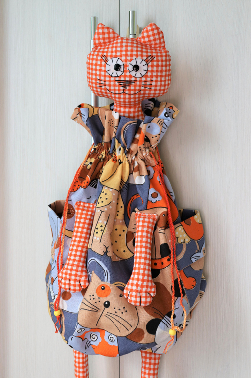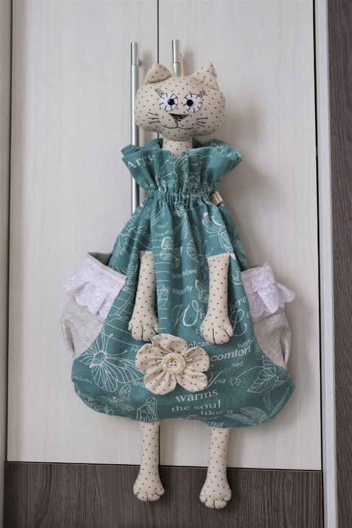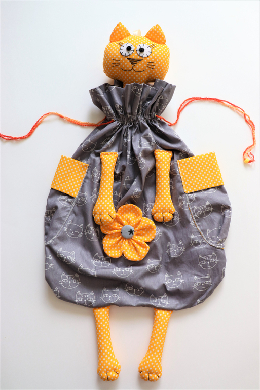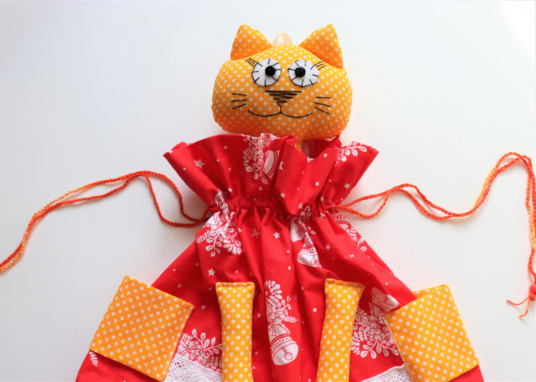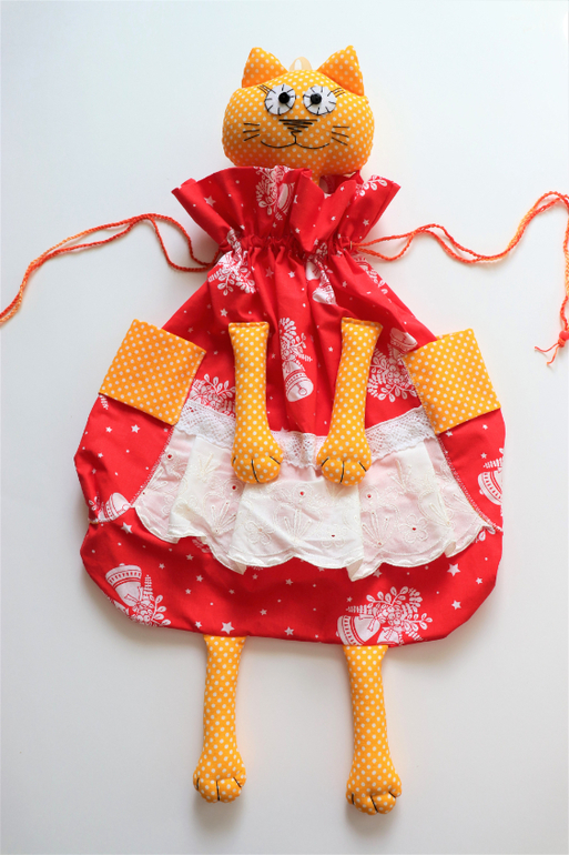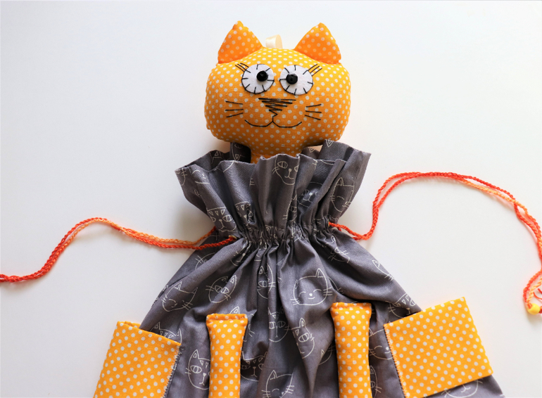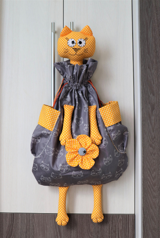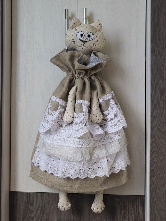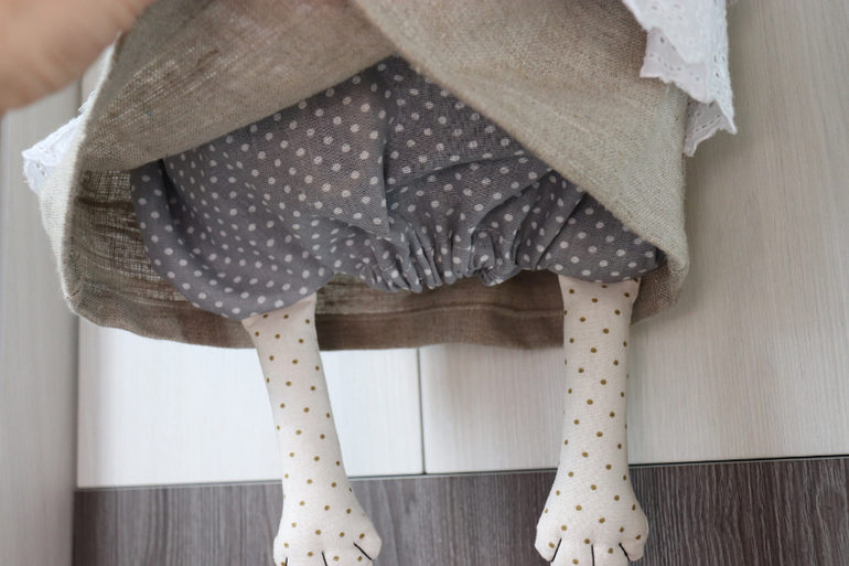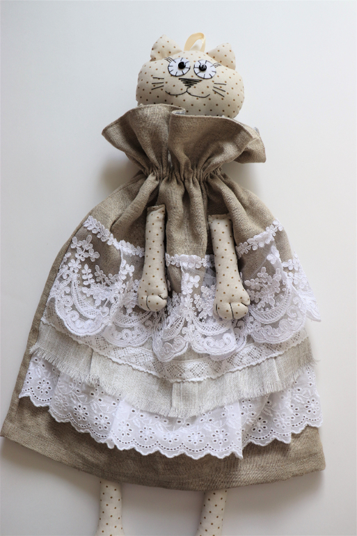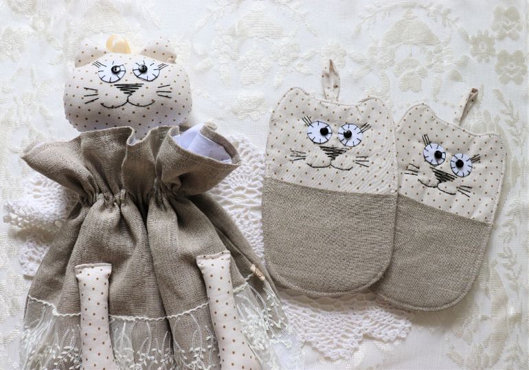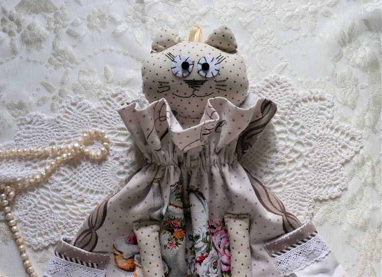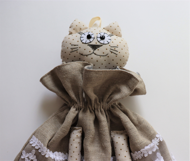 эта кошечка пошита из рогожки - ткань очень похожа на лен, внутри хлопковый подклад