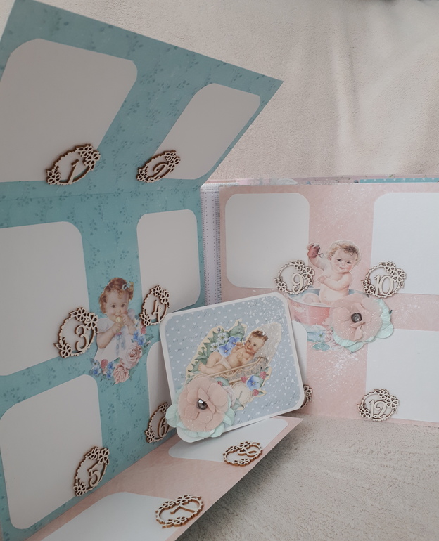 В альбоме 5 разворотов, вмещает около 50 фото, есть карточки с различными графиками роста, карточки для записи достижений каждого месяца, кармашки для узи, первого локона.